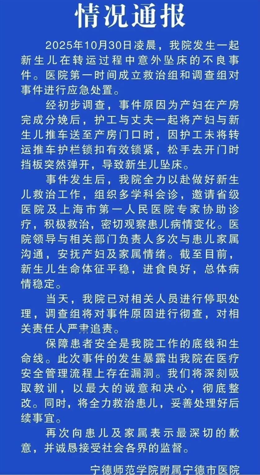10月31日,关于新生儿转运时坠床骨折事件,宁德师范学院附属宁德市医院给出了情况通报。 10月30日凌晨,产妇分娩后护工和家属推产妇与新生儿去病房,到产房门口,护工没锁好推车护栏去开门,挡板弹开孩子坠地。诊断显示孩子右顶骨骨折等多处伤。 医院第一时间展开救治,邀请多地专家会诊。目前孩子生命体征平稳。当天医院就停职了相关人员,会彻查原因追责。 A网友:现在医院的护工都是经过医院许可的,不知道从何时开始,医院里有了护工这个行当!不知道医院的护士们他们的职责是干什么的? B网友:以前病人没这么多,护士要干的活也没这么多,忙得过来;现在病人太多了,但是医院没钱招那么多护士,病人想得到更好的服务,就只能找护工了,这就跟学生的补习班一样,要是只想正常毕业,用不着上补习班,正常上学就行,但是大多数家长总想让孩子多获得点教育资源。 C网友:这样放着新生儿?我们生完娃儿都是单独放在有固定金属护栏的小床里推着走的。 D网友:我们医院都是把孩子放在产妇两腿中间,从来没有出现过问题。 可怜的孩子,刚出生就骨折,还没出产房呢!就因医护人员的疏忽遭了大难。这也暴露出这些医护人员,做事不仔细、缺乏责任心,医院管理流程有漏洞,希望医院真能吸取教训,好好整改,别让这样的悲剧再发生。
