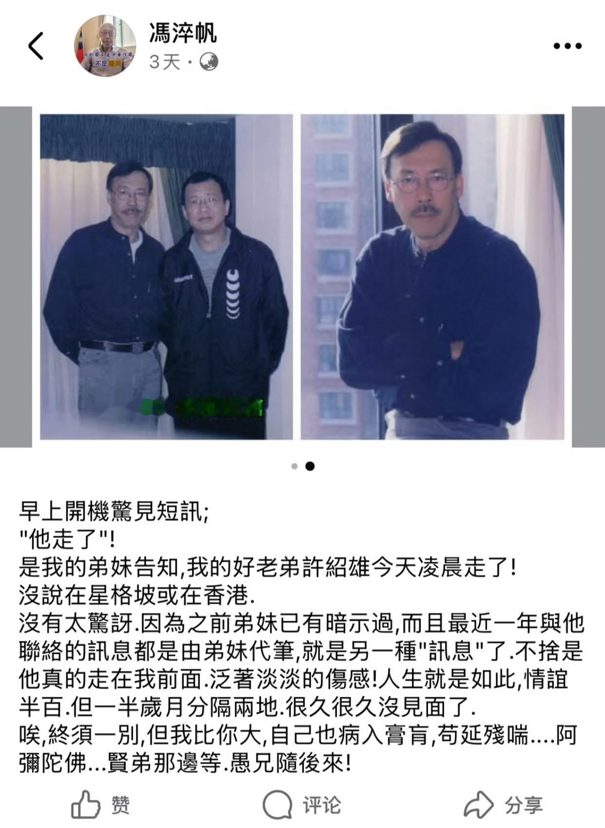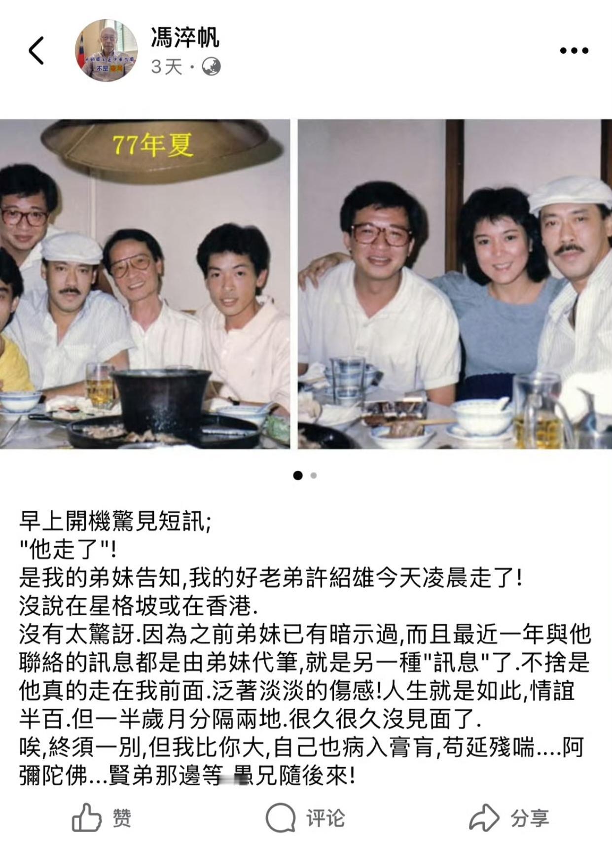 一语成谶!刚悼念完好友许绍雄,他就驾鹤仙逝。 香港演员冯淬帆去世,10月28日他还在社交平台发文,悼念刚去世的好友许绍雄。 他感慨人生聚散无常,并写下 "贤弟那边等,愚兄随后来" ,未料几日之后便因病去世。 冯淬帆曾出演《最佳损友》、《五福星》和《精装追女仔》等喜剧,那句“香蕉你个芭乐”成为影迷口耳相传的经典台词。 老年的冯淬帆长期受疾病困扰,自述已“病入膏肓,苟延残喘”,因许绍雄的离开感慨“人生就是如此,情谊半百,但一半岁月分隔两地,很久很久没有见面了,终须一别……” 那些留下经典的老演员们相继离去,只能在荧幕里感受他们的精彩,人生就是如此,平淡无奇也好叱咤风云也罢,大幕都会徐徐拉下。 好好珍惜,珍惜每一个有家人爱人和朋友陪伴的日子,人生海海,山山而川,大家终有一别。