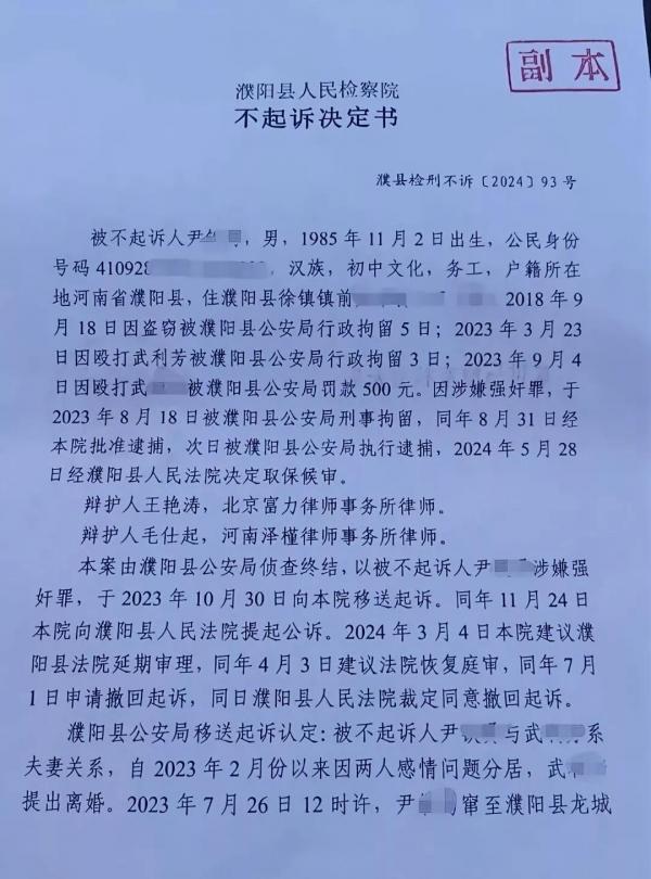 河南汉子尹某被关285天,只因妻子一句“婚内强奸”,如今拿着国家赔偿,心里却像压着块冷石头。 1985年生的尹某,初中毕业后就在老家讨生活,2013年和小六岁的武某结了婚,日子过得不咸不淡。谁料十年后情分尽了,武某两次起诉离婚,都因证据不足被法院驳回。 2023年7月的一个中午,武某跑到邻居家哭着求救,转头就报了警,说被尹某强奸还遭了家暴。警方当天立案,八月中旬就把尹某刑拘,九月初正式逮捕。 卷宗里写着,两人自二月起分居,尹某被指在家中强行与武某发生关系,还拍了视频想诬陷对方。可这说法,尹某自始至终不认,案件拖了近一年,两次庭审都没个结果。 2024年五月底,尹某取保候审走出看守所,身上的锐气早已被磨平。七月初,检察院突然撤回起诉,月底就发了《不起诉决定书》,理由很简单:证据不足,达不到起诉条件。 如今国家赔偿到手,按现行标准算,285天也该有十几万,可尹某说,这钱买不回被耽误的日子。网上吵翻了天,有人说婚姻里不该有“强奸”一说,有人骂家不是法外之地。 最高法院早有说法,婚姻非正常存续期间,丈夫可能构成强奸罪,但前提是证据确凿。尹某的遭遇,恰是给所有人提了个醒:感情没了可以好聚好散,拿司法当工具,最终只会两败俱伤。 法律的尺子该量罪恶,也该保护无辜。这285天的羁押,既是尹某的人生插曲,也是对司法审慎的一次叩问。你觉得婚姻走到尽头,该如何界定亲密关系的边界?