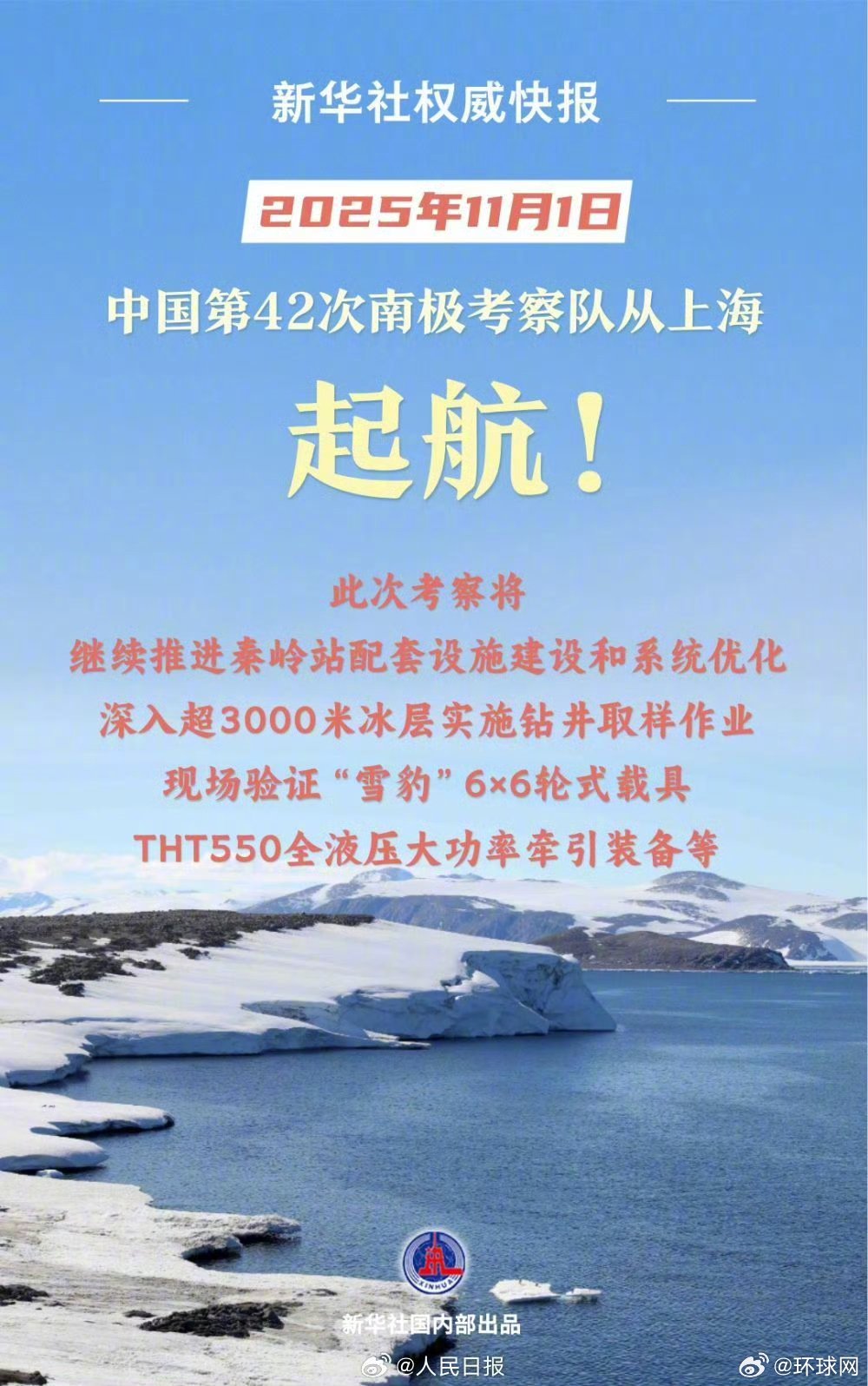 【起航!中国#第42次南极考察队出征#】#第42次南极考察队起航#2025年11月1日,由自然资源部组织的中国第42次南极考察队从上海起航,奔赴南极。本次考察围绕国家需求和全球科技前沿,继续推进秦岭站配套设施建设和系统优化,将首次开展南极内陆冰层深处湖泊科学钻探试验。考察由“雪龙”号和“雪龙2”号两船共同保障,预计2026年5月完成任务后返回国内。(人民日报)