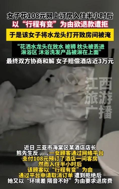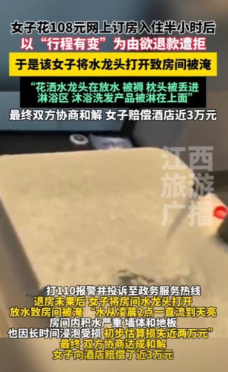 “太缺德了!”海南三亚,一女子入住酒店后,仅过了半个小时,她就要求退房,遭到拒绝后,女子将毛巾、浴巾、被褥、床单等丢进淋浴区,把花洒和水龙头全部打开,水从凌晨2点一直流到天亮,整个房间受损严重!网友:冲动是魔鬼。 据大象新闻10月31日报道,这事儿发生在28日的凌晨,一个从江西来的女游客,在网上花108块钱订了三亚一家酒店的房间。 大概凌晨一点左右,她办好了入住,拿了房卡进了屋,可谁也没想到,才过了半个小时,她就在预订平台发起了退款申请,理由也简单,就四个字:“行程有变”。 酒店负责人熊先生一看,这人已经住进来了,按照平台的规定,入住后是不能退款的,这在哪个酒店都是一样的规矩。 于是,他就好声好气地跟这位女顾客解释,说明情况,为了表示诚意,熊先生还主动提出,可以免费给她升级到一个带阳台的大床房,希望她能住得舒心一点。 按理说,酒店做到这份上,已经相当够意思了,自己行程变了,是自己的问题,酒店没责任,还主动给升级房间,这已经算是意外之喜了。 可这位女子根本不领情,她的态度非常坚决,就是必须全额退款,一分钱都不能少,眼看好说歹说都没用,这名女子开始找茬了。 她一会儿说酒店的隔音效果太差,影响她休息,一会儿又说房间的环境不尽如人意,反正就是各种挑毛病,目的只有一个,就是要钱。 紧接着,她就开始了“维权”操作,先是拨打了当地的政务服务热线投诉酒店,然后又直接报了警,警察很快就赶到了现场,了解了来龙去脉之后,也开始居中调解。 警察同志也是苦口婆心,跟她讲道理,摆事实,希望双方能各退一步,但是,无论警察怎么说,这名女子就是不松口,认准了酒店就该退钱,调解了半天,最后还是不欢而散。 就在所有人都以为这事儿会暂时告一段落的时候,谁也没料到,一场更大的闹剧正在酝酿,女子没再跟酒店纠缠,默默地回了房间,而酒店的工作人员也没多想,以为她可能是想通了,或者打算明天再说了。 结果第二天一大早,酒店的工作人员就发现不对劲了,一楼大厅的天花板竟然在往下滴水,水渍一片一片的。 大家赶紧顺着水迹往楼上找,最终发现源头就在这名女子的房间,工作人员敲了半天门也没人应,推开门的一瞬间,在场的人全都惊呆了。 房间里简直就像发了大水一样,积水已经没过了脚踝,房间里所有能搬动的东西,比如毛巾、浴巾、床单、被子、枕头,全都被她扔进了淋浴间里,堆成了一座小山。 淋浴间的花洒和洗手台的水龙头全都被开到了最大,哗哗的自来水正疯狂地往外涌,墙上的壁纸被水泡得卷起了边,木地板也因为长时间浸泡而发胀变形,整个房间一片狼藉。 更过分的是,她还把酒店提供的洗发水、沐浴露全部挤出来,倒在了那些被褥上,很明显,这是女子在协商无果后,采取的报复行为,她人早就已经离开了,只留下这么一个烂摊子给酒店。 酒店方面看着被毁坏的房间,又气又无奈,当即选择了再次报警,并且提供了监控录像和房间的惨状作为证据。 警察通过预留的身份信息,很快就联系上了这名女子,并依法对她进行了传唤,当她再次回到派出所,面对警察的严肃批评和法律知识的普及,她才终于意识到自己这次真的玩过火了。 她以为这只是小打小闹,泄泄愤而已,却没想过自己的行为已经触犯了法律,根据法律规定,故意毁坏他人财物,数额达到五千元以上,就可以构成故意毁坏财物罪,需要承担刑事责任。 酒店初步估算了一下损失,光是维修地板、墙纸和更换被褥这些直接损失,就已经超过了两万元,这个数额已经达到了“情节严重”的立案标准。 如果酒店坚持要走法律程序,她不仅要赔偿全部经济损失,还可能面临牢狱之灾,听到这里,女子彻底慌了神,之前的嚣张气焰也荡然无存。 她开始痛哭流涕,表示自己只是一时冲动,知道错了,希望酒店能给她一个机会,看着她后悔的样子,酒店方面也动了恻隐之心。 毕竟,开门做生意,和气生财,把一个年轻人送进监狱也不是他们想看到的结果,最终,经过协商,双方达成了和解。 女子一次性赔偿了酒店近三万元的经济损失,酒店则不再追究她的法律责任,这件事在网上传开后,网友们几乎是一边倒地指责这名女子。 有人说:“为了108块钱,赔进去3万,这智商真是感人。” 还有人评论:“这不是维权,这就是赤裸裸的破坏,成年人该为自己的行为负责!” 这件事给我们所有人都敲响了警钟,作为消费者,维护自己的正当权益没有错,但必须通过合法的渠道。 因为一点小事就情绪失控,采取极端的报复手段,最终伤害的不仅是别人,更是自己,而作为服务提供方,面对不理智的顾客,有时候即使赢了道理,拿了赔偿,也可能输了心情,耗费了精力。 所以,这3万块钱,对女子来说,是她为自己的“巨婴”行为支付的一笔昂贵的学费,而对于酒店来说,这更像是一笔无奈的“精神损失费”。 信源:大象新闻2025-10-31