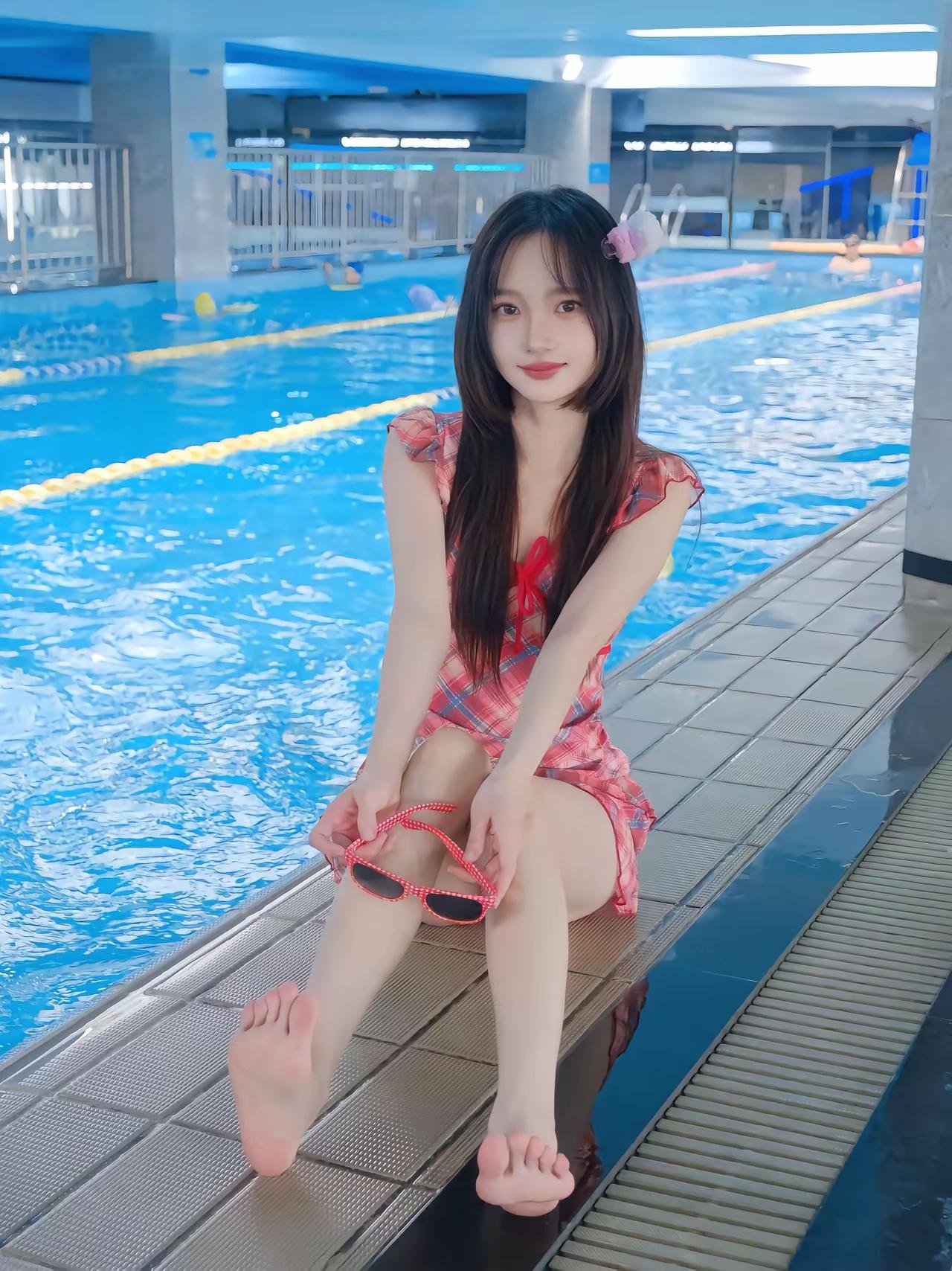 夏日泳池边,红格子泳衣少女,阳光洒满笑颜米饭,馒头,哪个好吃 有没有喜欢瑜伽的