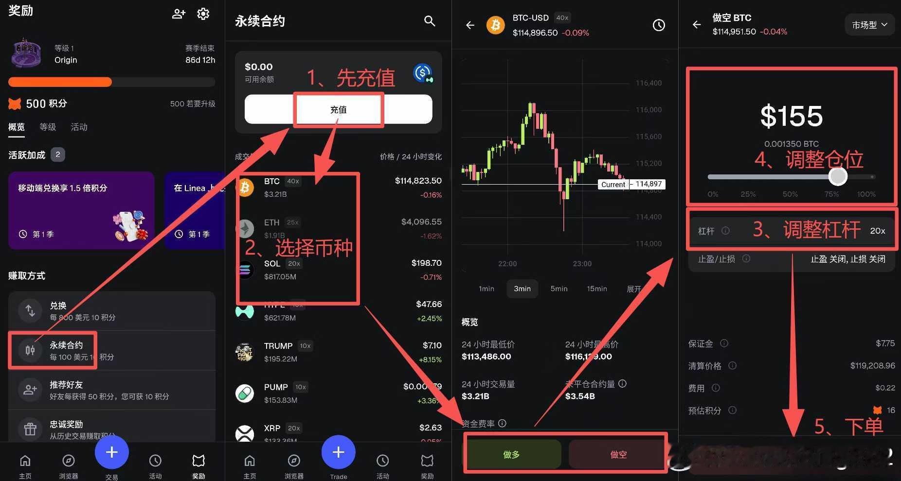 赚取方式——永续合约——充值——可以选择任意资产进行充值——选择想要交易的币种——调整仓位和杠杆——下单