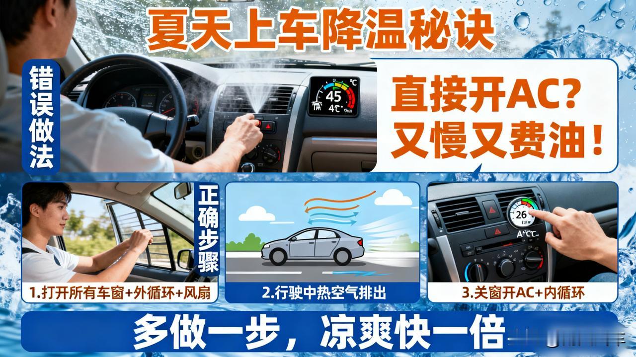 夏天上车别急着开空调!多做一步更凉快 暴晒后的车内像蒸笼,直接开AC效果慢还增加负荷。应该:先打开所有车窗,开启外循环和风扇,把热空气吹出去。 行驶一两分钟后再关窗开AC,切换内循环,降温速度飞快! 汽车降温技巧 空调开热 汽车换气方法 汽车空调功能 车内的降温攻略 空调能开多热 空调外循环