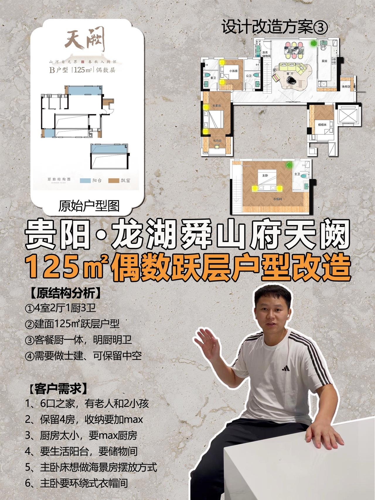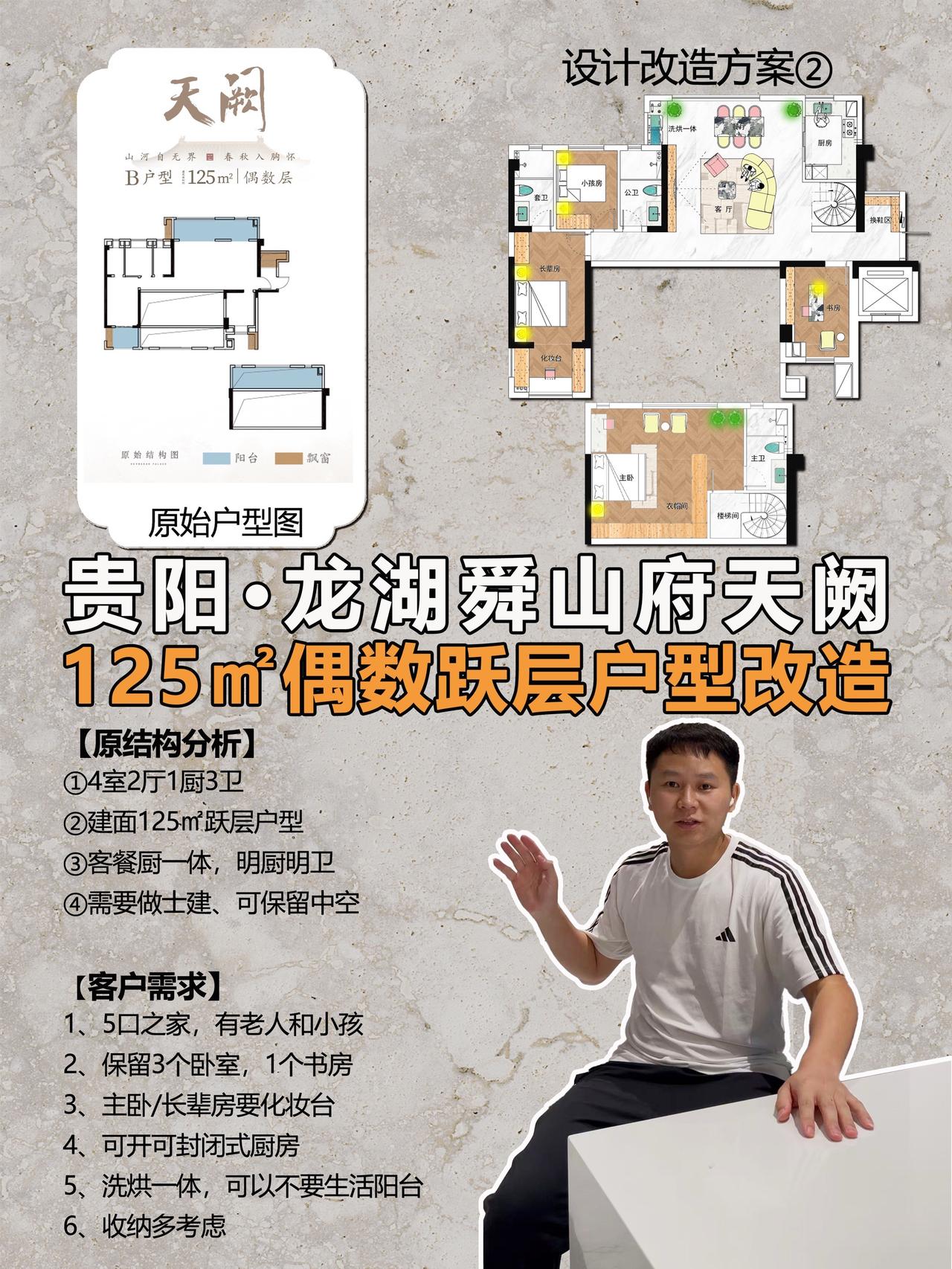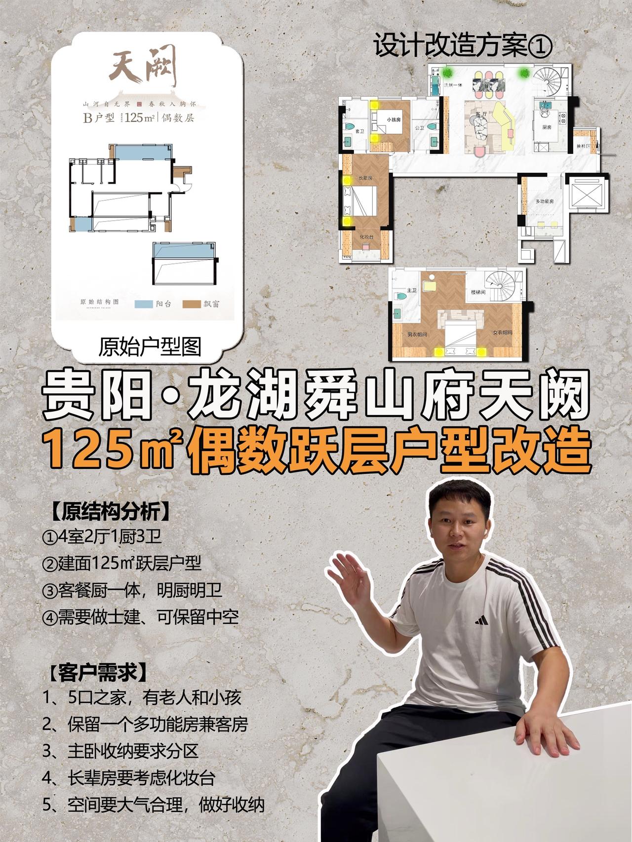 贵阳装修🏡龙湖舜山府125㎡跃层设计!朋友们,大家好❗️ 今天给大家带来的是龙湖舜山府125平偶数跃层户型装修设计方案,一起来看看吧💋 👉如果你是同户型的业主朋友,你会选择哪个设计方案呢?可以打出来喔~✅更多定制设计方案,🉑当面沟通哦👀 💬项目信息 📍楼盘:龙湖舜山府 📏面积:125㎡ 🏠户型:跃层(4室2厅1厨3卫) 🏠 【原结构分析】 ①4室2厅1厨3卫 ②建面125m.跃层户型 ③客餐厨一体,明厨明卫 ④需要做士建、可保留中空 📝【客情需求3️⃣】 1、6口之家,有老人和2小孩 2、保留4房,收纳要加max 3、厨房太小,要max厨房 4、要生活阳台,要储物间 5、主卧床想做海景房摆放方式 6、主卧要环绕式衣帽间 📝【客情需求2️⃣】 1、5口之家,有老人和小孩 2、保留3个卧室,1个书房 3、主卧/长辈房要化妆台 4、可开可封闭式厨房 5、洗烘一体,可以不要生活阳台 6、收纳多考虑 📝【客情需求1️⃣】 1、5口之家,有老人和小孩 2、保留一个多功能房兼客房 3、主卧收纳要求分区 4、长辈房要考虑化妆台 5、空间要大气合理,做好收纳 📄【个人案例】 中铁阅花溪|中铁逸都|中铁阅山湖|阅山湖云著|华润悦府|中海映山湖|茅台广场|美的林城|金融城|融创九樾府|中海印龙泉|华润九悦|龙湖天曜|龙湖湖山原著|万科鸣翠|万科麓山|铁建城|龙湖舜山府|远大美域|观山小区|建发和玺|保利公园 。。。。。。 贵阳装修 龙湖舜山府 龙湖天曜 龙湖观萃