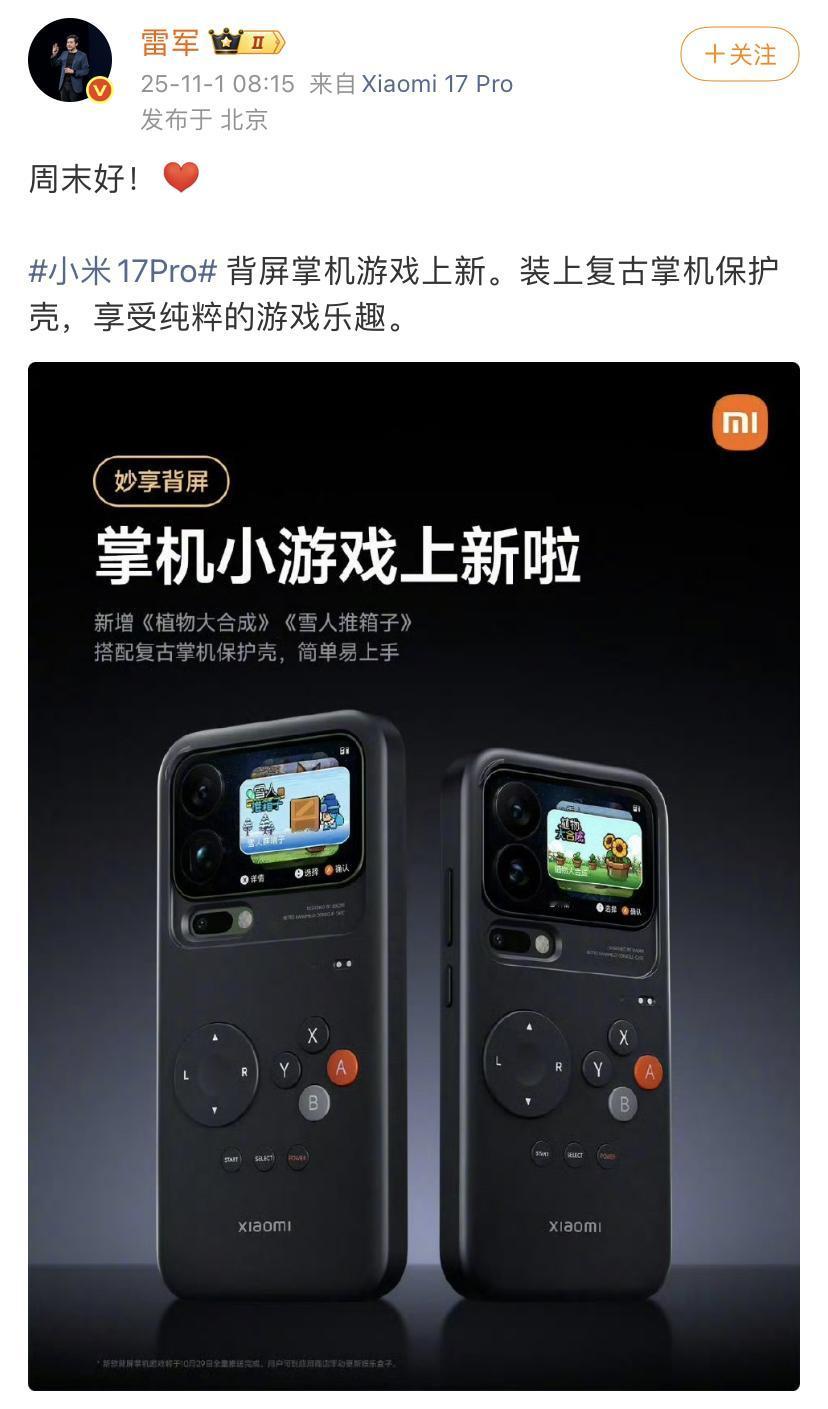 雷军:小米17Pro背屏掌机游戏上新。装上复古掌机保护壳,享受纯粹的游戏乐趣! 这个就相当于我们小时候玩的游戏机,不过小米把它做了成了手机保护壳,通过这个保护壳可以直接玩一些小游戏,非常经典的诸如魂斗罗,超级玛丽等游戏。 这个设计感还是非常厉害的,增加了玩乐属性,各位是怎么看的?欢迎评论区留言。