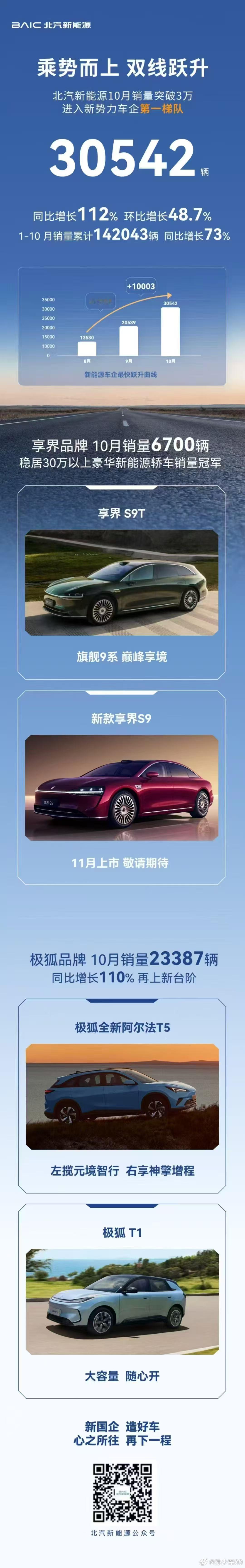 北汽新能源10月交付30542台其中享界6700台,极狐23387辆最近北汽的势