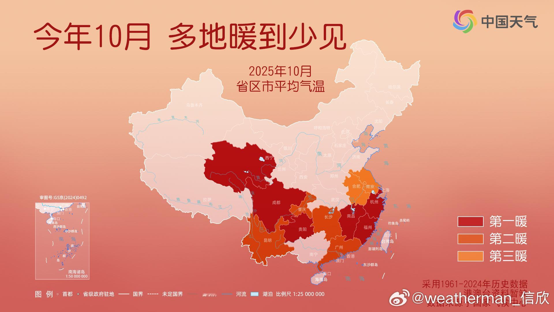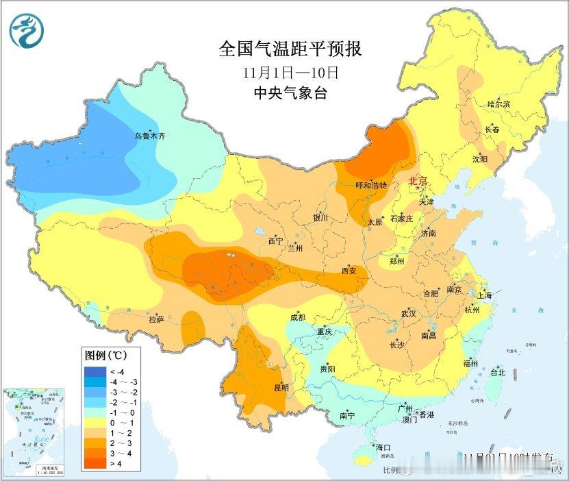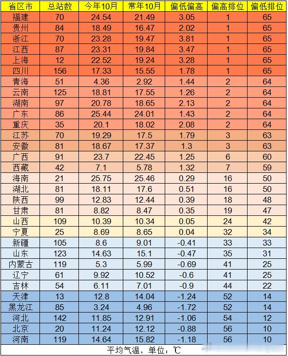 【气温回顾和展望】今年10月我国的气温,北方大多偏低,南方大多偏高。上海、浙江、福建、江西、贵州、四川6个省市平均气温打破当地10月最高纪录。预计11月上旬,除新疆大部、西南部分地区平均气温较常年同期偏低1~2℃外,全国其他大部地区气温偏高1~3℃或接近常年。