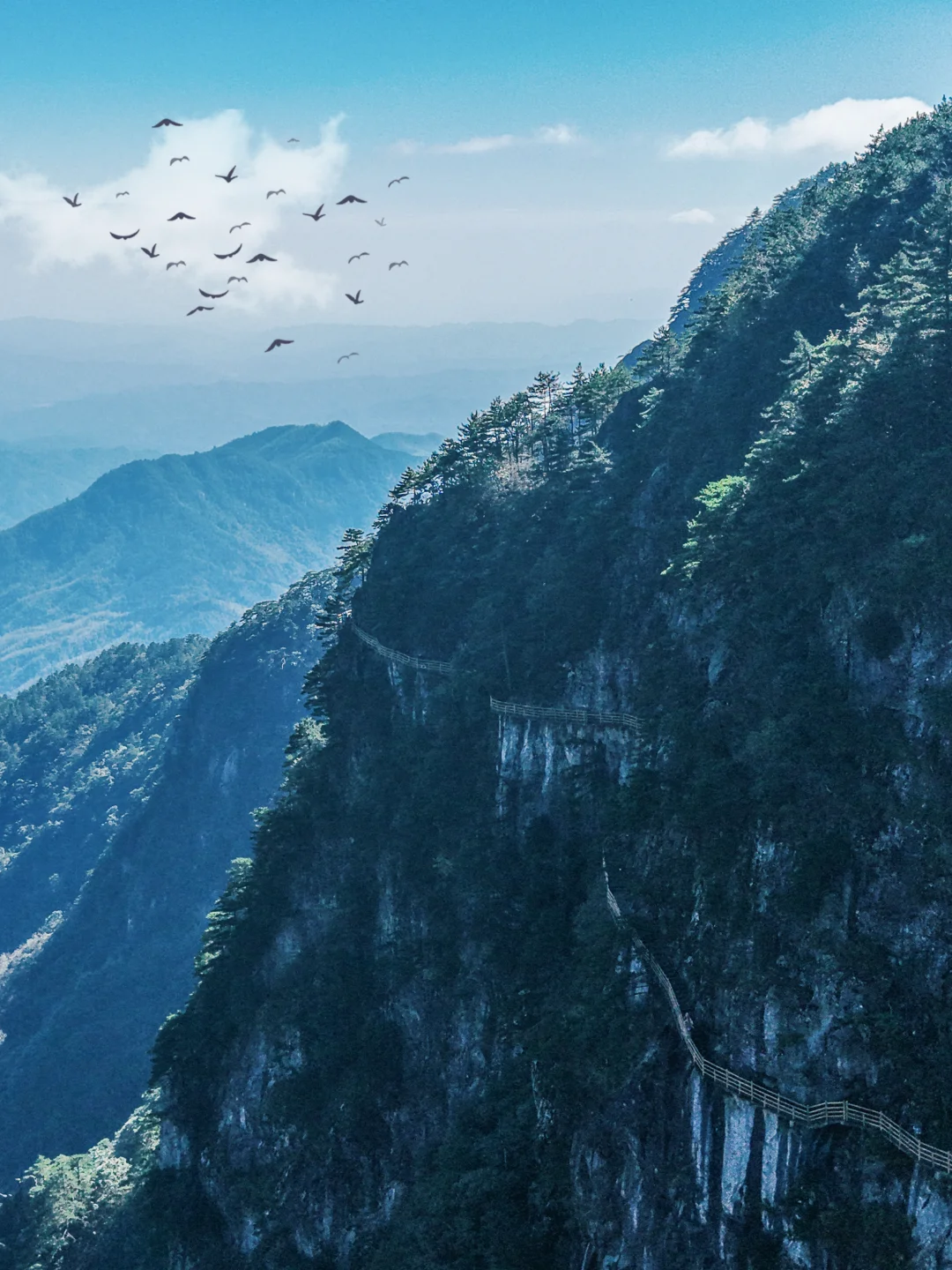 青云栈道如巨龙盘旋,云谷飞瀑天上银河落九天,