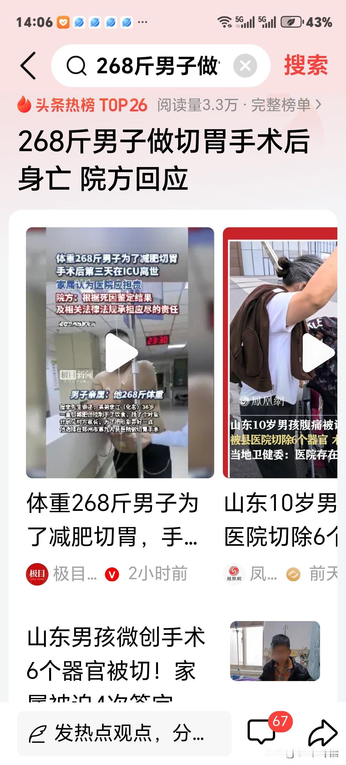减肥最好的方法?是辟谷少吃!而不是切胃手术!据悉河南一男子,1米74身高,286市斤体重,为找对象想减肥,故而去医院寻求解决办法,当然医院自会有招了,经过诊断代谢综合症,并拿出解决方案切胃手术!虽然手术成功,但第四天便因呼吸衰竭而死亡!为什么?据该医院院方说,患者有高血压,高脂肪病。至于算不上医疗事故?待调查! 我认为要相信现代医学,当下胃手术不属大手术,就是说切胃成功率很高,故手术过程中不会出现问题。况且正规医院医生都有行医证,合法专业人士,因此医疗事故可能性不大,甚至没有!不信可等调查结果! 那患者为何身亡?答案以经有了呼吸衰竭吗?再说患者有打鼾症状,故而才呼吸受阻,最后衰竭实属符合逻辑。 有人会问大胖子咋办?我看应该学习一下教道中的健身方法,叫辟谷。就是老百姓所说的少吃食。按教道运气方式方法,少喝点水,多多少少吃点清淡水煮面,这样半月下来,可瘦下来,笔者身边有用这种方法减肥成功人! 最后声明,我绝没有质疑现代医学之意。只是我认为道教是中华传统文化一部分。其中辟谷乃道士修身养性一种方法,对减肥有帮助而己。因此如今人们了解一下道教,学习一下道教有用方式方法,难道不好吗?文化自信应该有吧?写到此笔者遥祝河南这位减肥男子一路走好天堂安息!