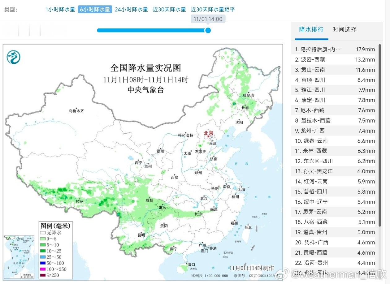 【降水和干燥】今天白天,西北到华北黄淮多地,晴朗干燥。北京石家庄银川下午相对湿度不足20%。今天白天东北以及西南等地出现降水。今天下午到明天中午,降水会继续向东推进,黑龙江部分地区会出现大雪-暴雪。西藏东南部,四川南部,云南部分地区将有大雨,局地暴雨。 ​​​