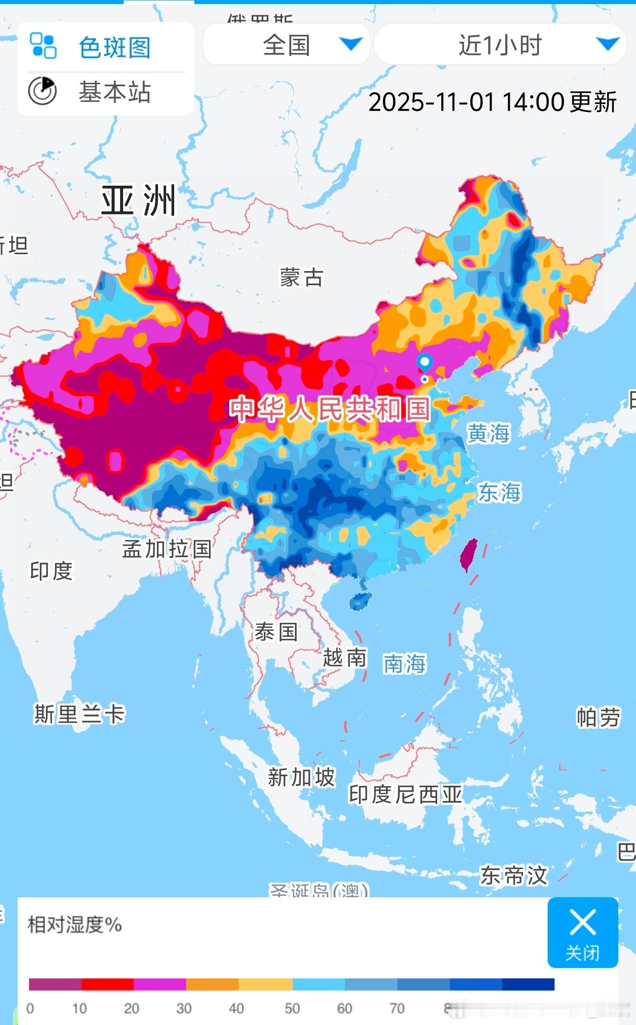 【降水和干燥】今天白天,西北到华北黄淮多地,晴朗干燥。北京石家庄银川下午相对湿度