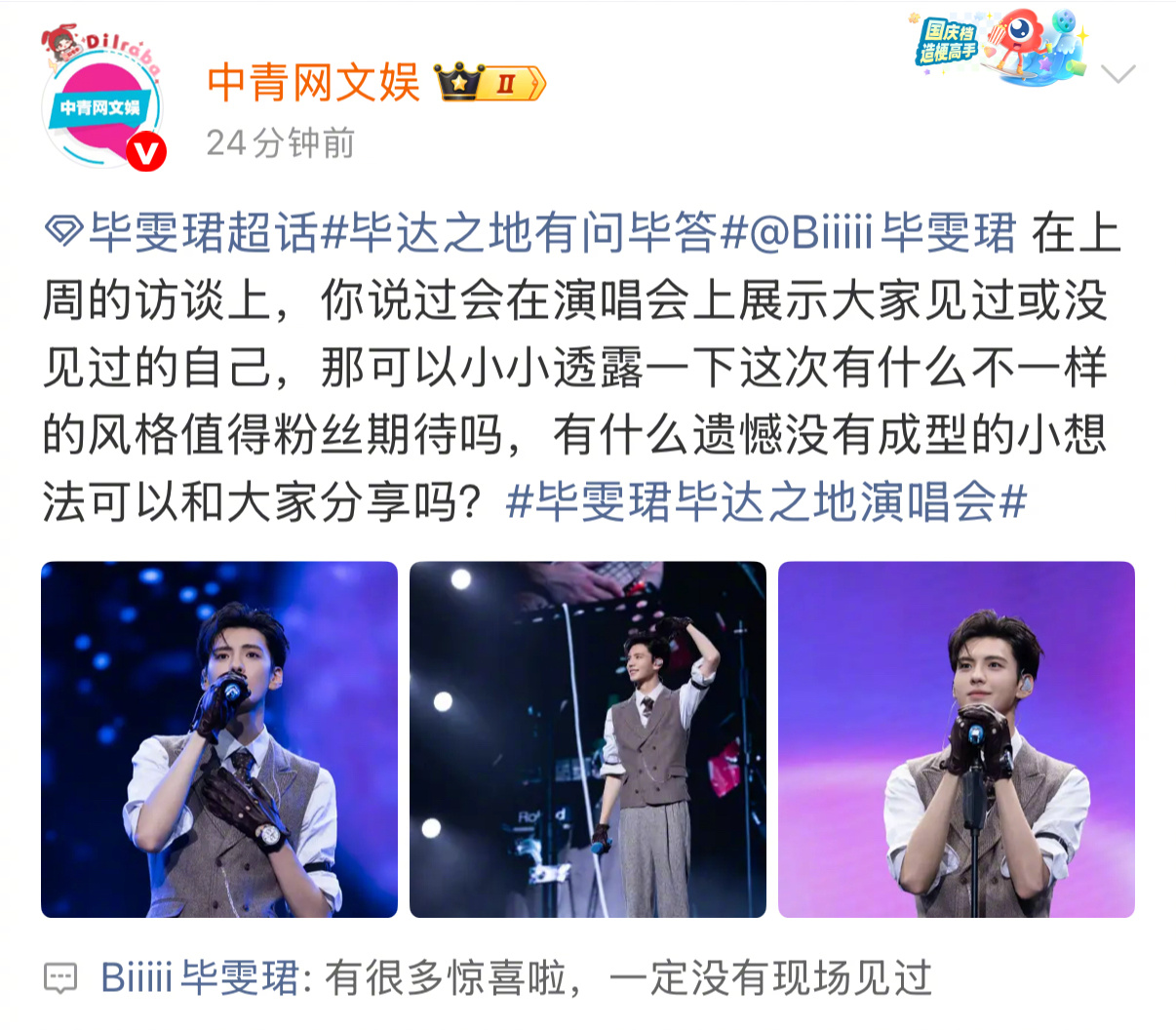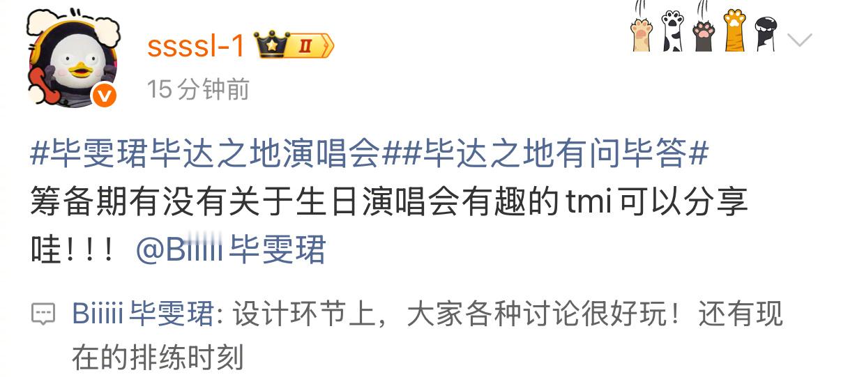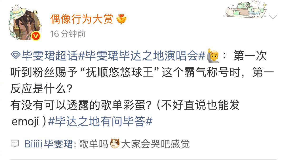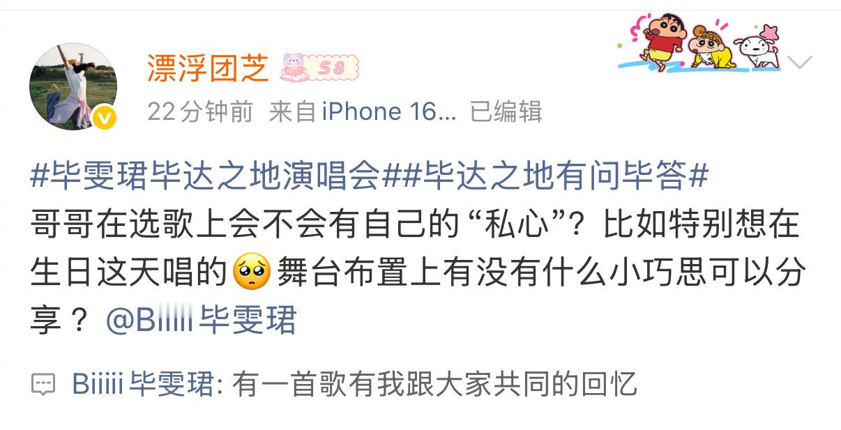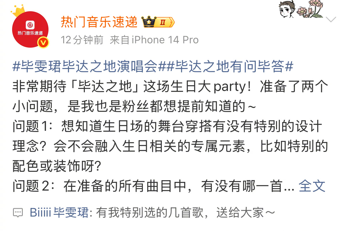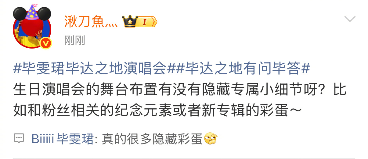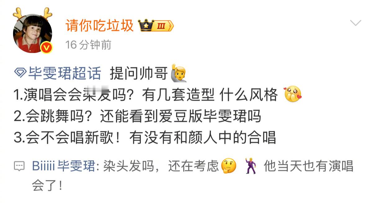 毕雯珺 回完你的回你的 演唱会惊喜预埋到!毕雯珺演唱会即将开始,今天就先来给大家透露些惊喜,说会有大家会哭的歌单,还在考虑要不要染头发。好好好,接连几个问题一起问,已经想象到毕雯珺键盘擦出火,小脑瓜嗷嗷转的画面了!总而言之,毕雯珺演唱会期待就完事儿!