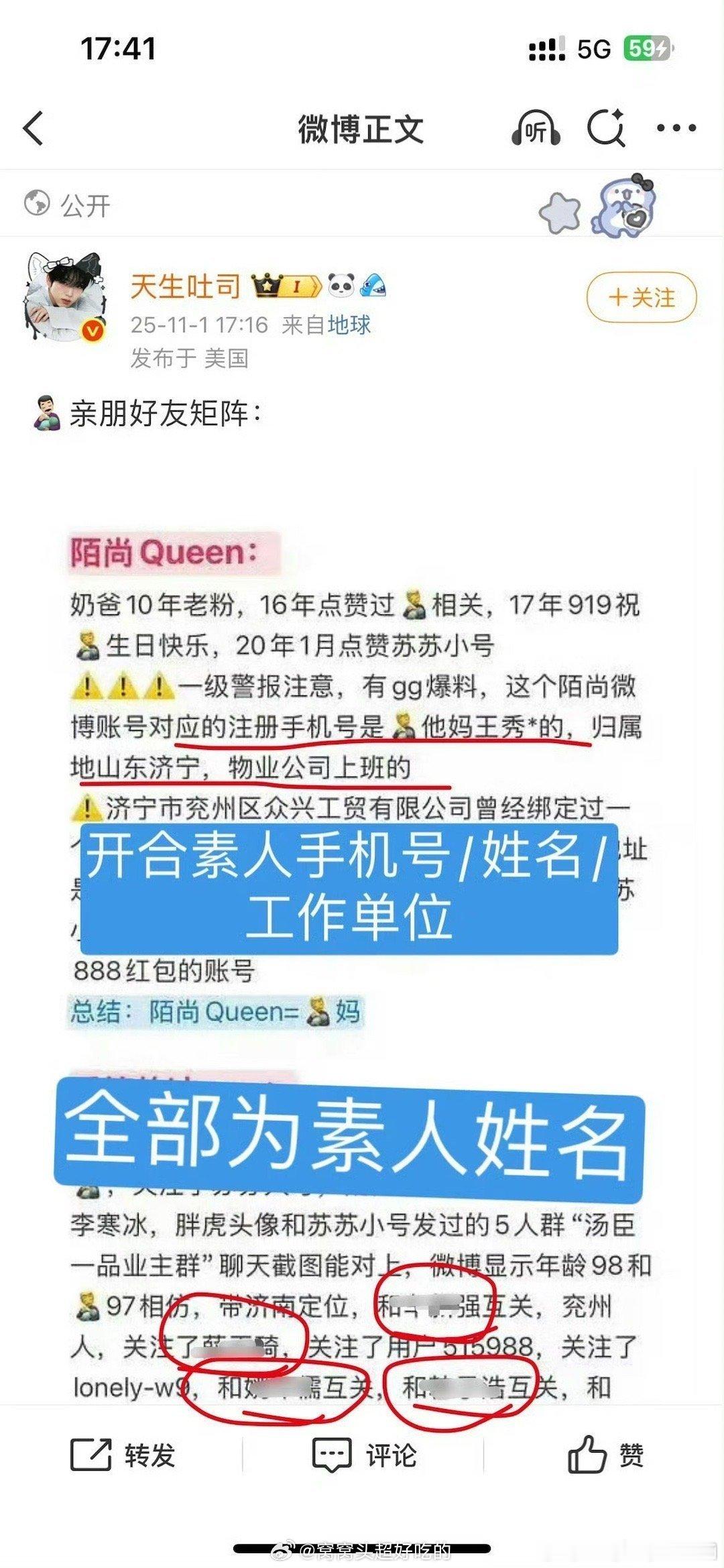 您好,我要举报图中用户,此人公然在微博平台传播非法取得的素人用户信息及其相关联用户身份信息,然后造谣成明星亲人,严重违反了平台社区规定,请平台严肃处理,给予该用户永久封禁处理,并追责转发扩散的用户。