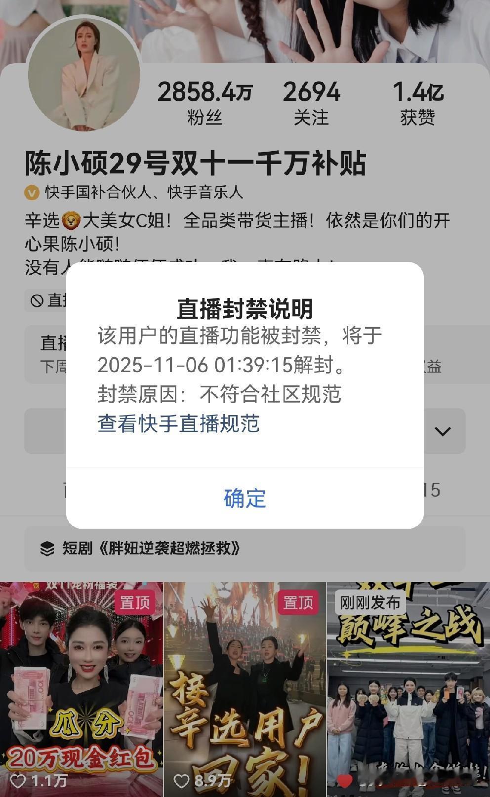 陈小硕封禁时间是7天,按日子推算应该是下个礼拜四解封,但陈小硕发布视频称周三将要开播,也就是说陈小硕账号随时解开,另外陈小硕上次被封也是下播后封的。这说明什么?