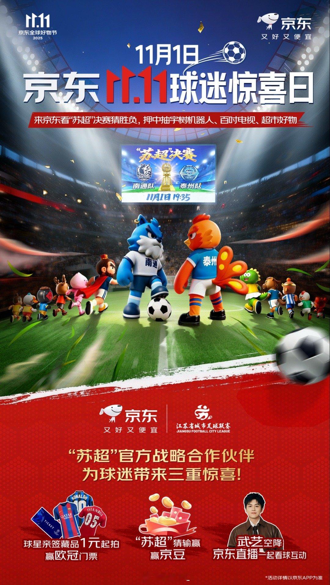 京东苏超决赛直播11月1日京东11.11球迷惊喜日,苏超决赛南通队对泰州队的大战要炸了!这俩队碰面必是火星撞地球,我已经搬好小板凳等开赛了!