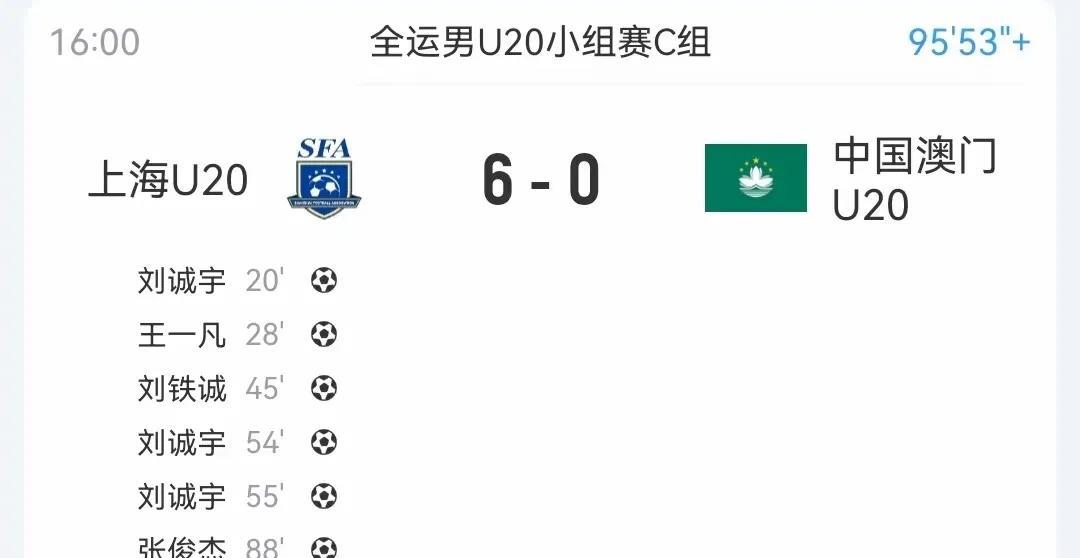 刘诚宇1人独进3球,上演帽子戏法,打过国足、亚冠和中超的比赛就是不一样,刘诚宇在U20全运会大开杀戒,简直是降维打击啊!上海U20队6比0大胜中国澳门U20,刘诚宇和上海海港双子星:蒯纪闻和李新翔组成三叉戟一起出战,刘诚宇25分钟内就上演帽子戏法,看样子,踢上高质量比赛就是不一样,刘诚宇这一年进步还是挺快的,未来潜力无限!