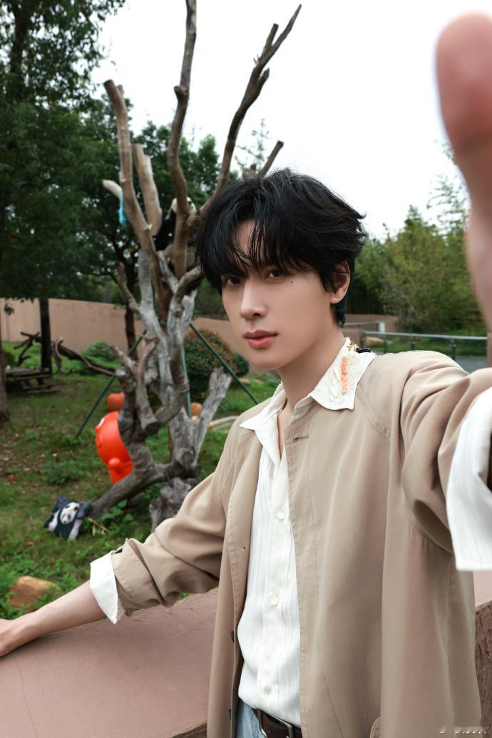 展轩和熊猫自拍展轩和熊猫自拍,又帅又萌的展轩上线,棕色风衣造型和熊猫比耶自拍