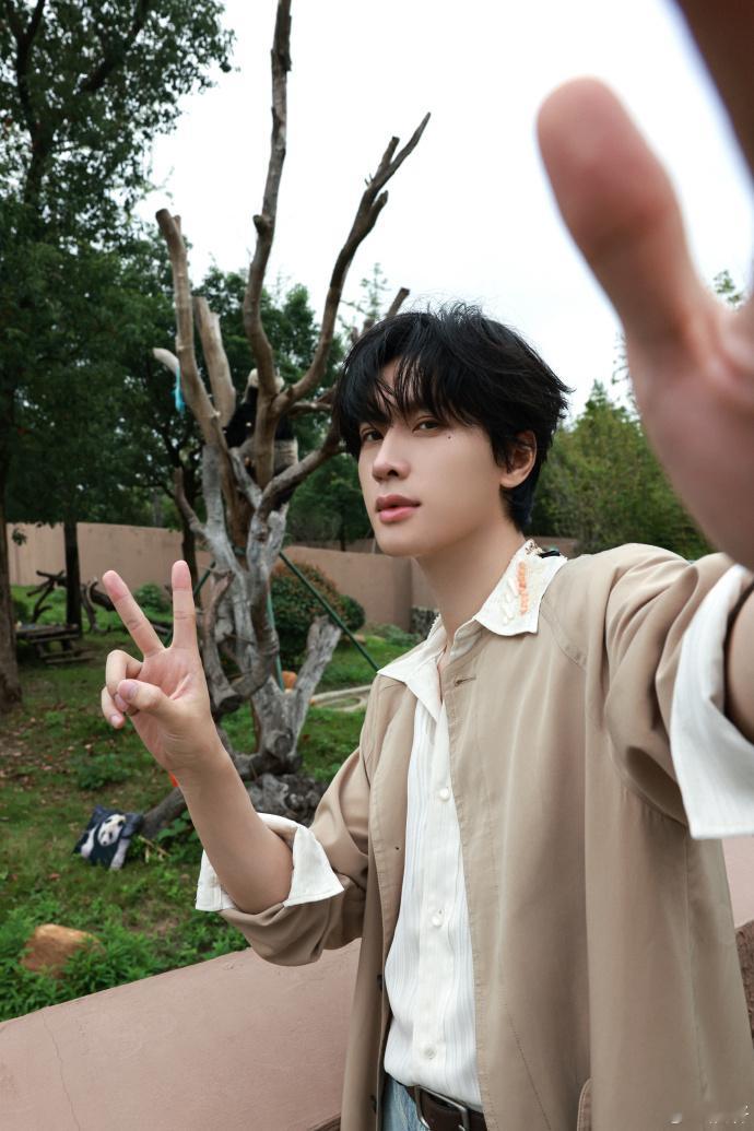 展轩和熊猫自拍 展轩和熊猫自拍,又帅又萌的展轩上线,棕色风衣造型和熊猫比耶自拍