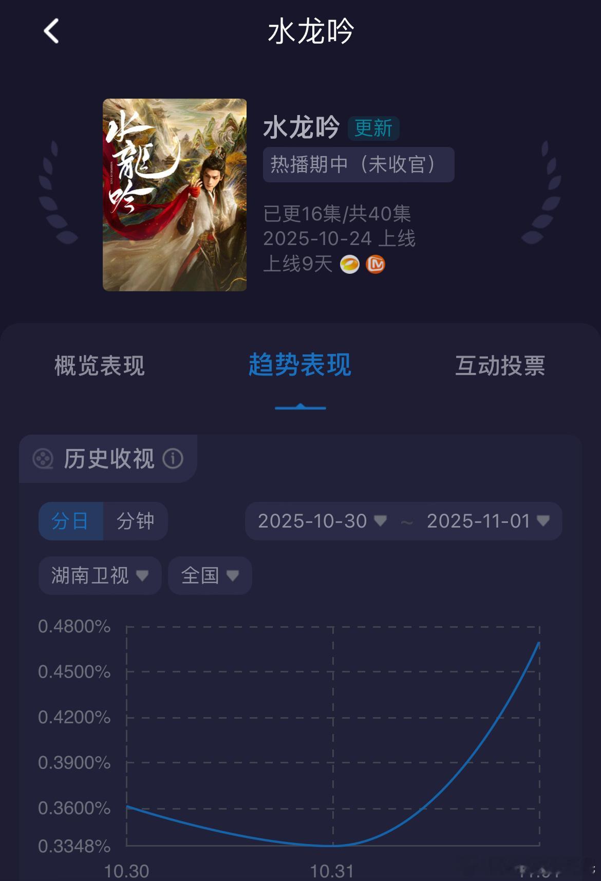 罗云熙水龙吟上星第三天,酷云收视率起来了!0.4695,峰值0.625