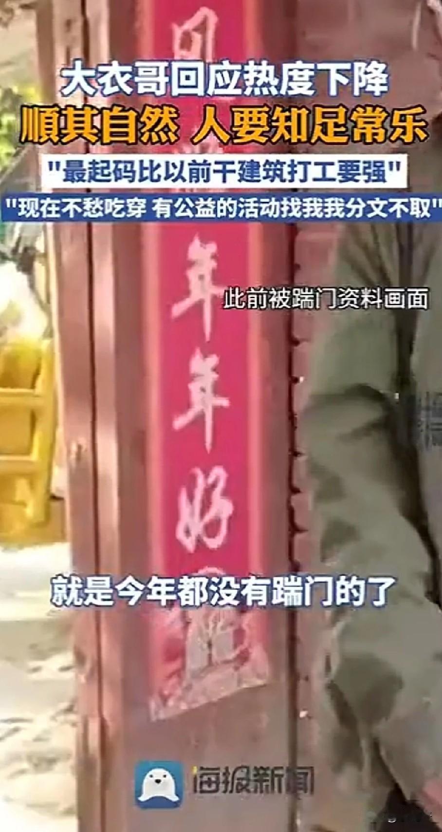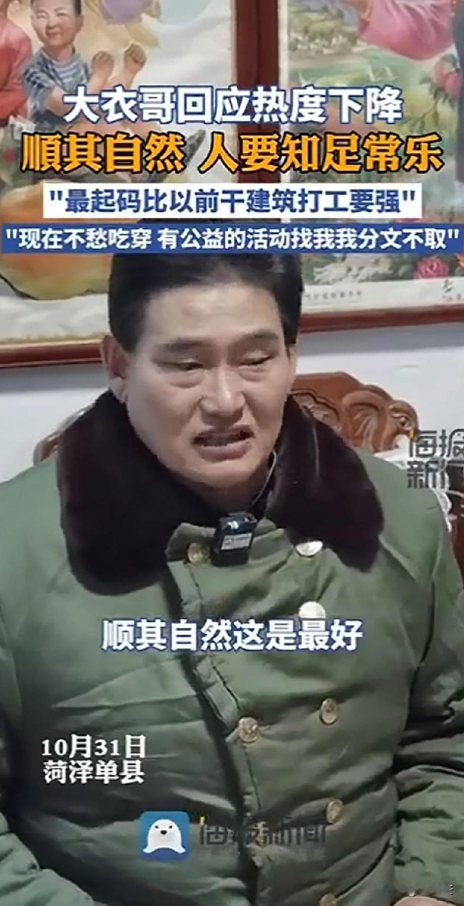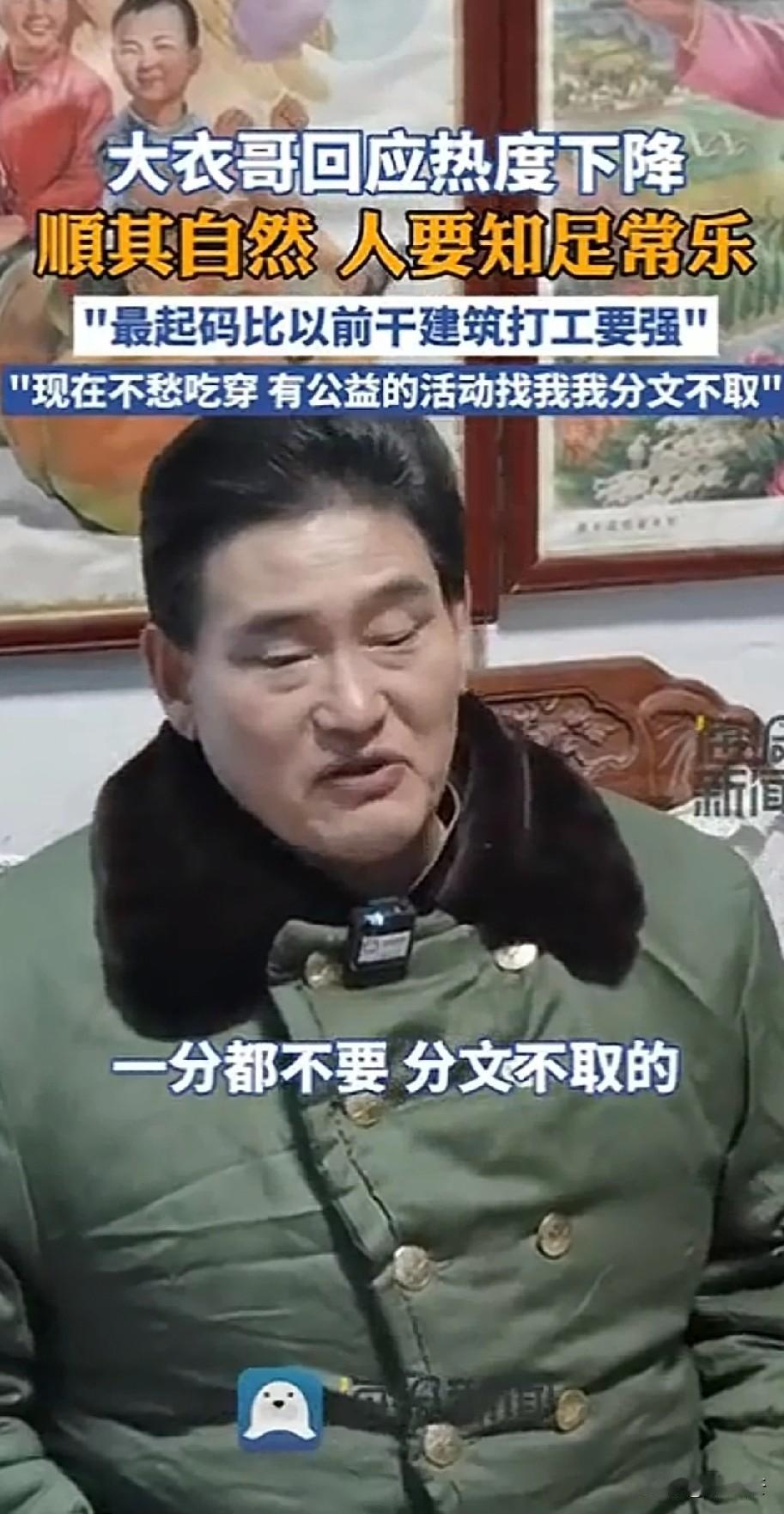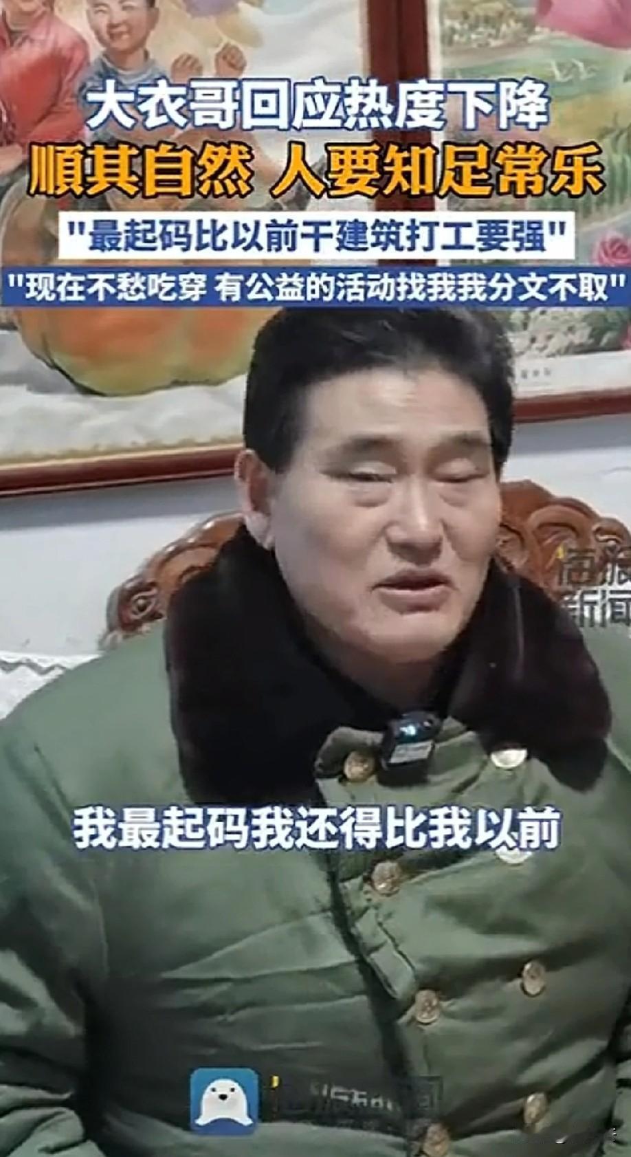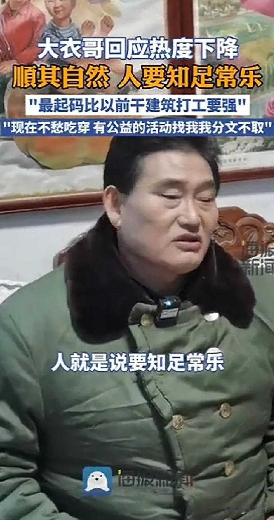 大衣哥真清醒,虽然是暴发户性质获得财富,但是老老实实守住了自己的钱财,除了唱歌,不带货不炒股,也不创业,就守着一亩三分地,一家老小美滋滋过日子! 直言不火也知足,现在吃穿不愁,挣的不少。虽然还穿着军大衣,但再也不用吭哧吭哧出苦力挣钱了,还是比以前好太多了。 如今流量爆红就如雨后春笋。一天火好几个,终于没有人天天蹲他家门口,踹门都不走,以前几天就把门踹坏了,一家人不敢外出,连去隔壁儿子家看孙子都得借个梯子走邻居家,根本不敢走大门。 现在没有了热度,回归普通人的生活。还是穿着自己的军大衣,但是明显人发福胖了很多,生活真的改善不少。 他说知足常乐,现在虽然找他的人少了,但是比以前干建筑队打工出苦力强多了,人应该知足,最起码家里也没有踹门的,理性下来是好事。 之前短视频爆火的时候,光拍大衣哥的生活都能当个正儿八经的工作,邻居村里人都拿着手机拍。甚至有人在他村里还整了大衣哥民宿,专门来接待游客挣钱。 大衣哥说,之前那些村民拍他挣钱,他就给人家说,能挣钱拍就拍吧,但是这个也不是个长久的法子,万一以后没有流量不火了,劝村民要另谋出路,这个不能当饭吃。 确实清醒,还是唯一一个暴发户性质,名气大还没飘,难得!