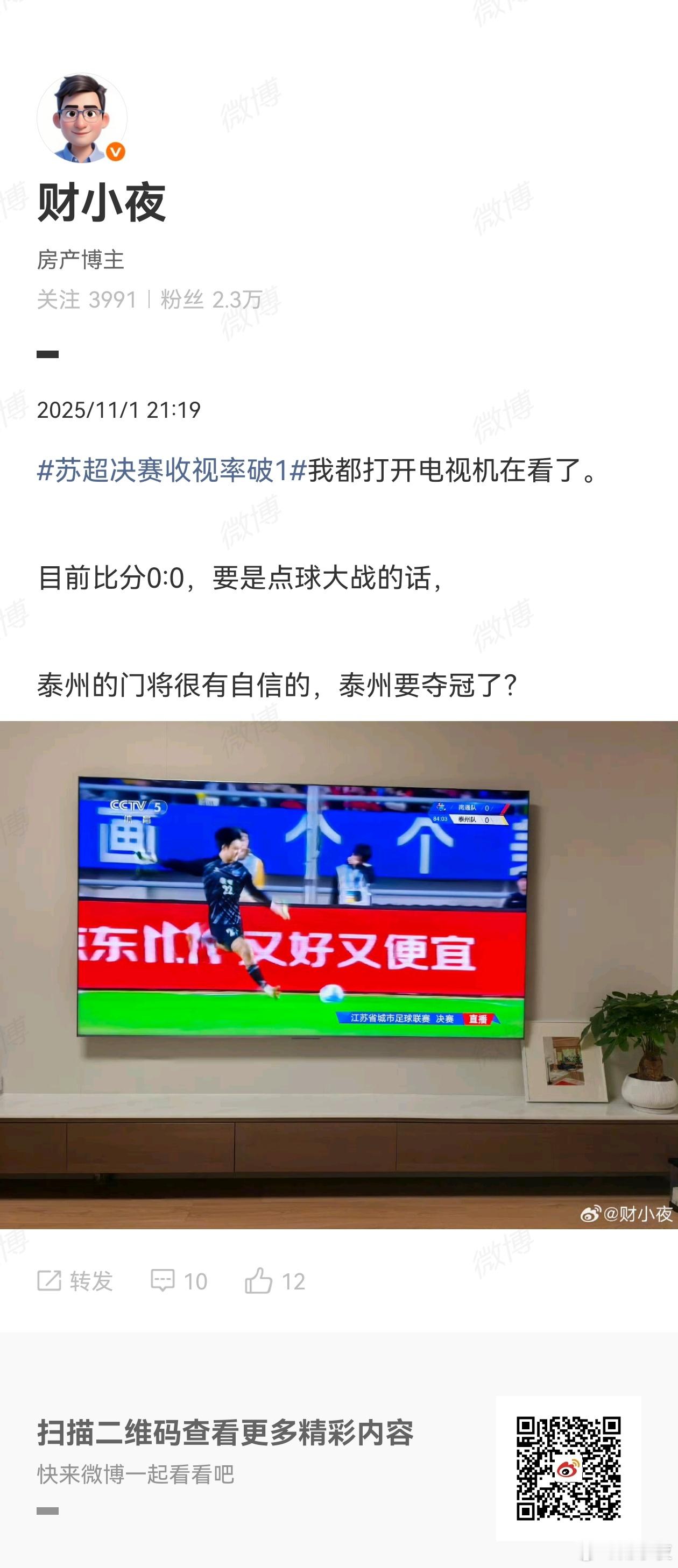 苏超决赛收视率破1我都打开电视机在看了。目前比分0:0,要是点球大战的话,泰州的