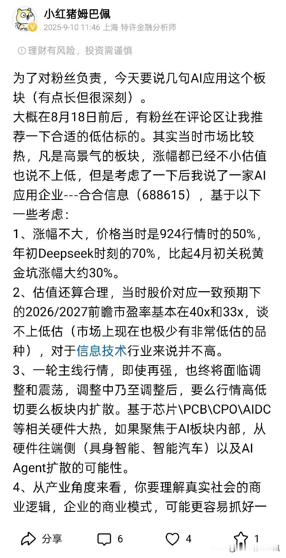 两个月前,我说了这样一家企业,你关注到了吗? 因为日常覆盖的研究范围非常广,宏观也看,中观行业&产业政策也看,公司日常粗略跟的大概有120家左右(基本每个行业都会拿一两家作为行业“温度计”来跟),直接买入配置在组合中的大约有50家。所以我不会像头条有些“老师”那样,长期向你猛烈推荐2~3家公司,当然也有避免踩荐股红线的考虑。 8月中旬有粉丝问我标的,我提了一家公司--合合信息(详见图片),当然短期涨跌谁也难以预测,半个月左右后,我特意花了不少篇幅,详细讲了一下逻辑。因为我觉得你单说一家公司好,不把逻辑讲透是不负责的,把逻辑讲出来,别人自己再加以分析,同时如果你的逻辑不对,别人也可以避免踩你的坑。这是一个从业人员应有的负责态度。 可惜的是,头条并不识货,这样一篇粉丝评价“含金量很高”,同时我也认为深度是头条某些老师教授数倍的文章,给了很少的展现量,阅读者也寥寥。 目前两个多月了,再把这篇文章,结合公司股价,拿出来看一下,从结果来看,我的观点和逻辑基本得到了验证,这样的收益率也能战胜那些天天吹几家公司好的老师了吧。我差不多也是从推荐粉丝开始建仓的,当时建仓了1000股,在盈利30%左右出了400股,像这种行业景气又抓到主升浪的标的怎么去退出确保客观利润,我觉得以后也可以单开一条说说。 原文链接再贴一下,大家可以参考底部卡片🔗