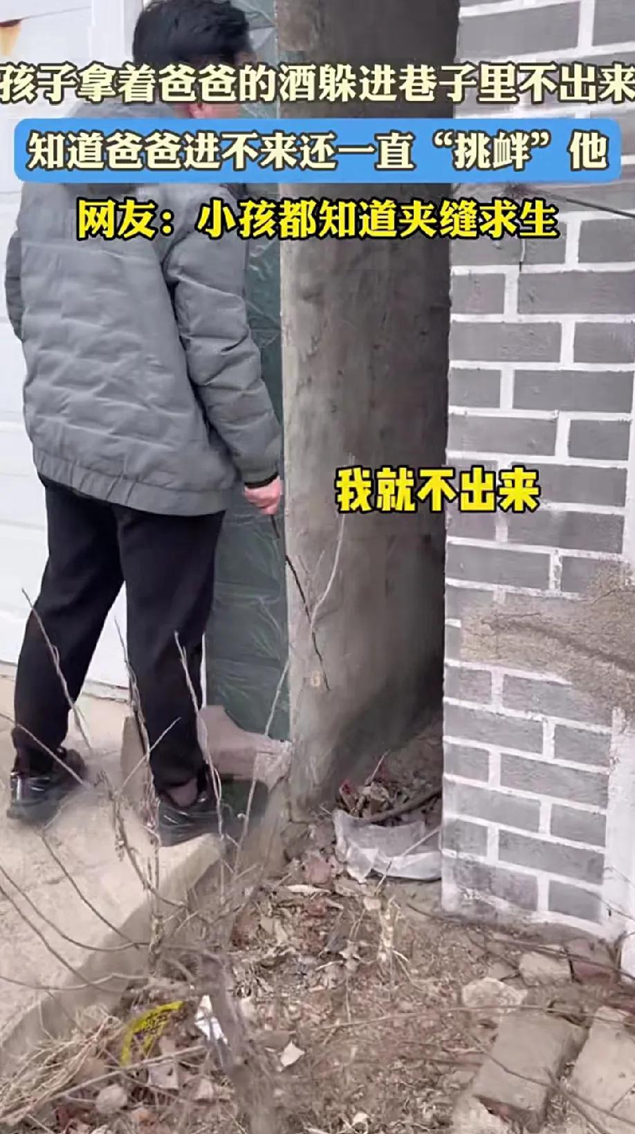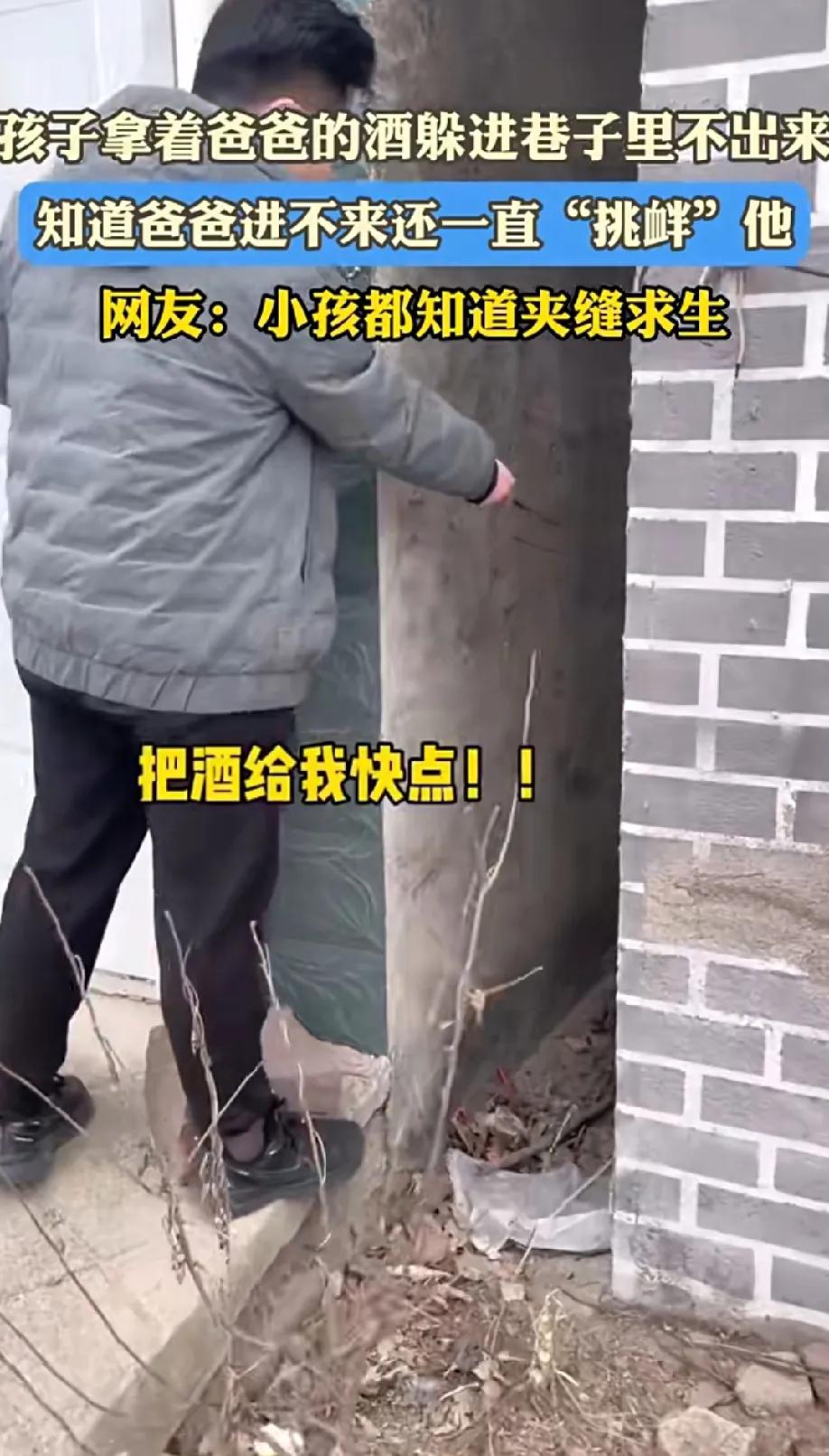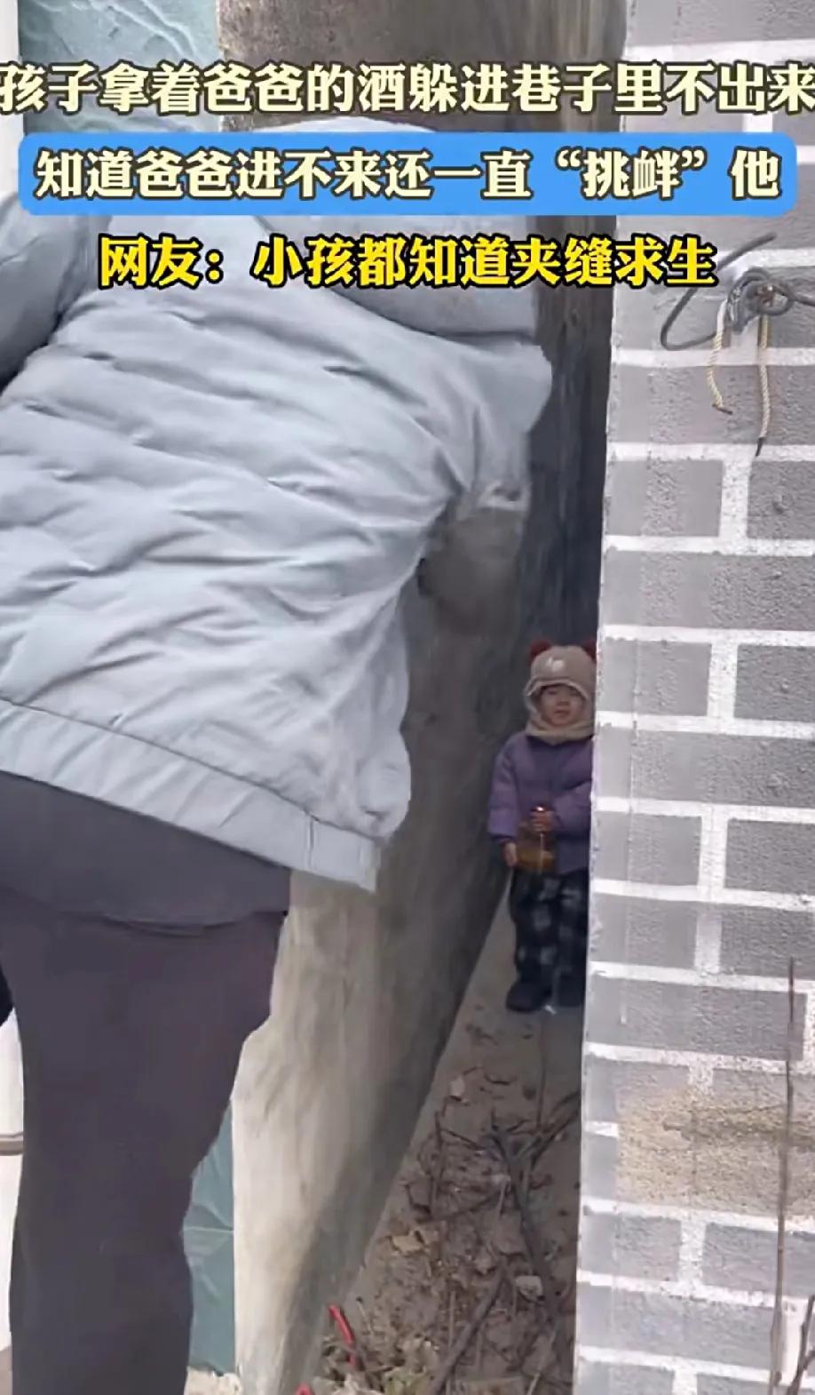小孩拿着爸爸的酒躲进巷子里,爸爸拿着棍子指着小孩喊话快出来,“我就不出来”“把酒给我快点”“有本事你进来呀!” 奶声奶气的,太可爱了,明知道爸爸进不来还一直“挑衅”他。气得爸爸扶着墙踮起脚跟,想着用棍子够到小孩。无奈,缝太小,进不去,棍子不长,够不到。太搞笑了,求爸爸心理阴影面积。 当然,也不是没有办法把小孩哄出来。爸爸把小棍子换成冰糖葫芦、棒棒糖之类,或者笑着告诉他带他去买玩具,人不就出来了? 这一幕真是“夹缝求生”具象化!虽然小孩“挑衅”不对,但是小酌怡情,大醉伤身。如若不是爸爸喝酒过度,小孩也不至于出此下策。 建议爸爸以后还是少喝酒,身体健康最重要。小孩初衷还是好的,就是方式有点过。小人鬼大,好好沟通!