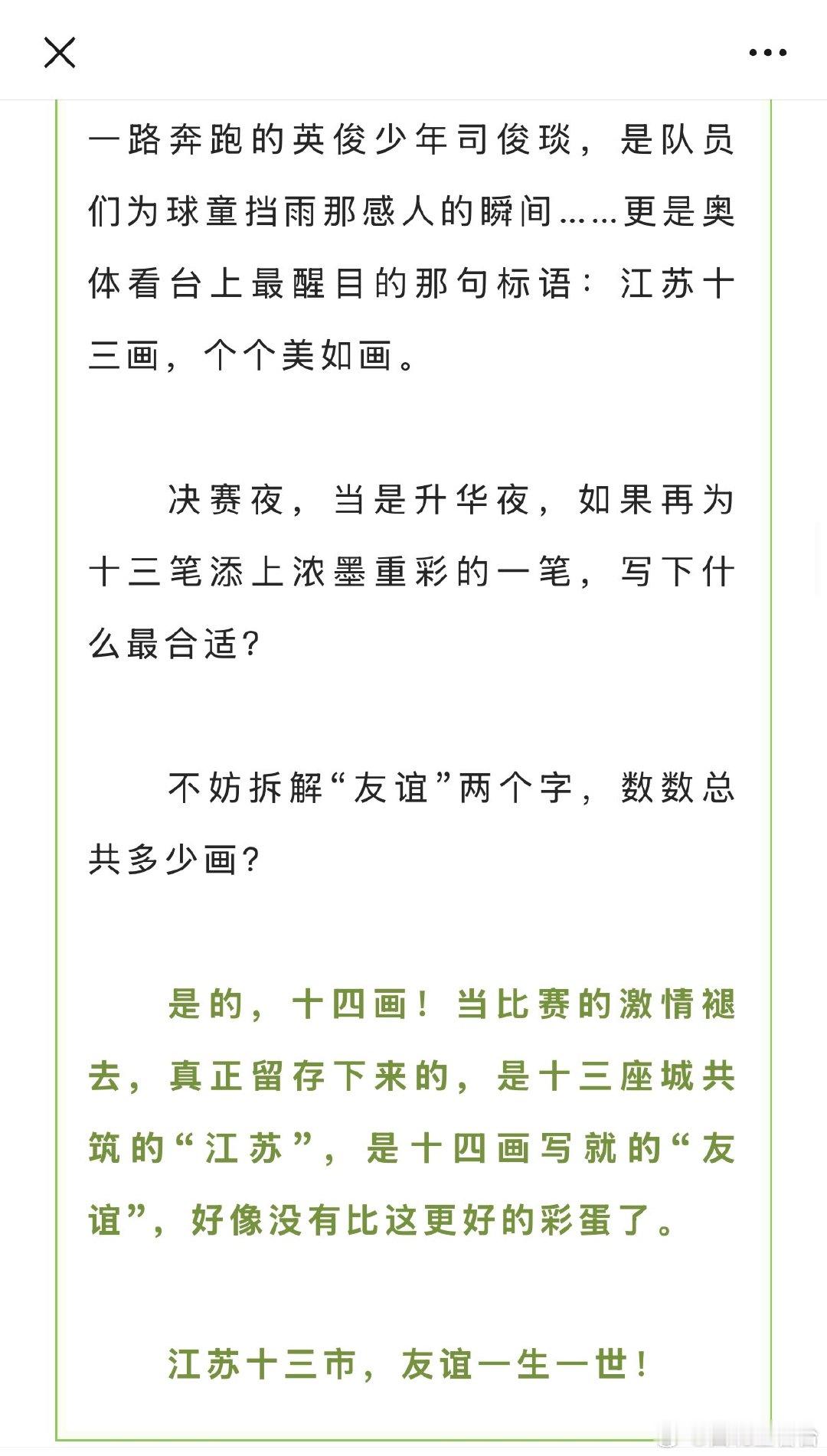 是的,十四画!当比赛的激情褪去,真正留存下来的,是十三座城共筑的“江苏”,是十四画写就的“友谊”,好像没有比这更好的彩蛋了。