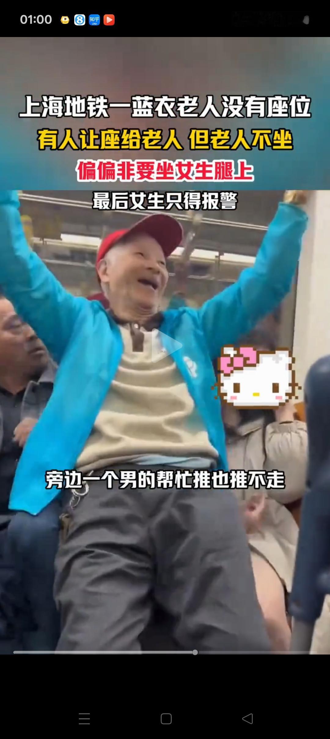 这下好了, 不只上海,全国都知道了! 上海地铁上,一位老人拒绝别人让给他的座位,非要坐在女孩的腿上,还一脸的笑,推都推不开。 一旁的大叔都急眼了,帮忙推了几次,老人还是无动于衷。 连大叔都感慨:要不是不能打人,我真的*** 之前发生了什么我们不清楚,但是老人这么做多少有点过了,没必要赌气。 还有女孩也没有必要去和老人计较这个座位,让给他算了。 你永远无法理解这个老人当时想的啥,也惹不起他,还是保持距离的好[捂脸][捂脸]