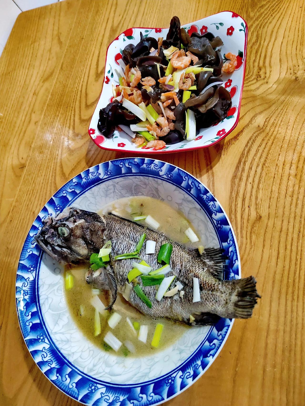 昨天翻冰箱,找出来一条黑鱼。 想起来还是上次去海边买的剩下的,于是拿出来化着。 晚上做了黑鱼汤,还有朋友在东北捎来的黑木耳泡了点,简单的拌了一下,凑合了两个菜。 再盛上两碗中午蒸的米饭,晚饭就这样了。
