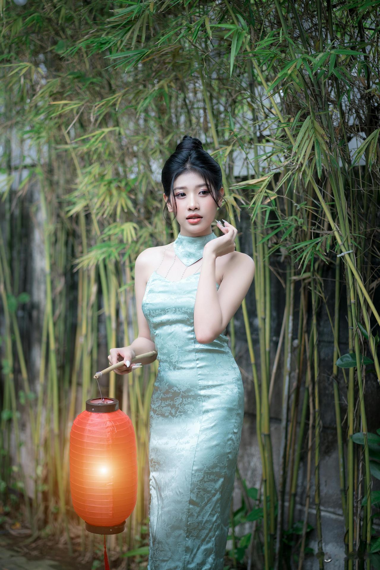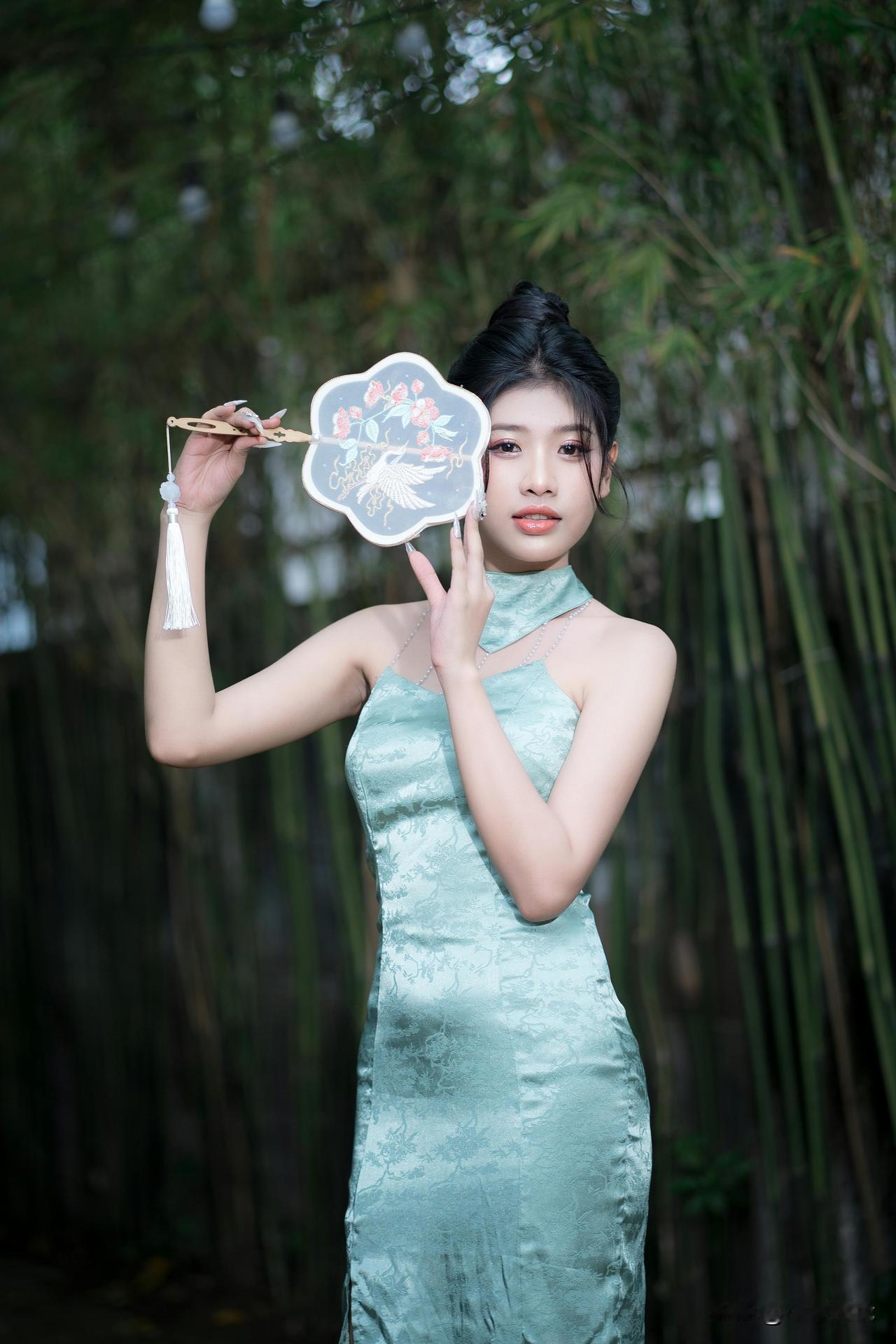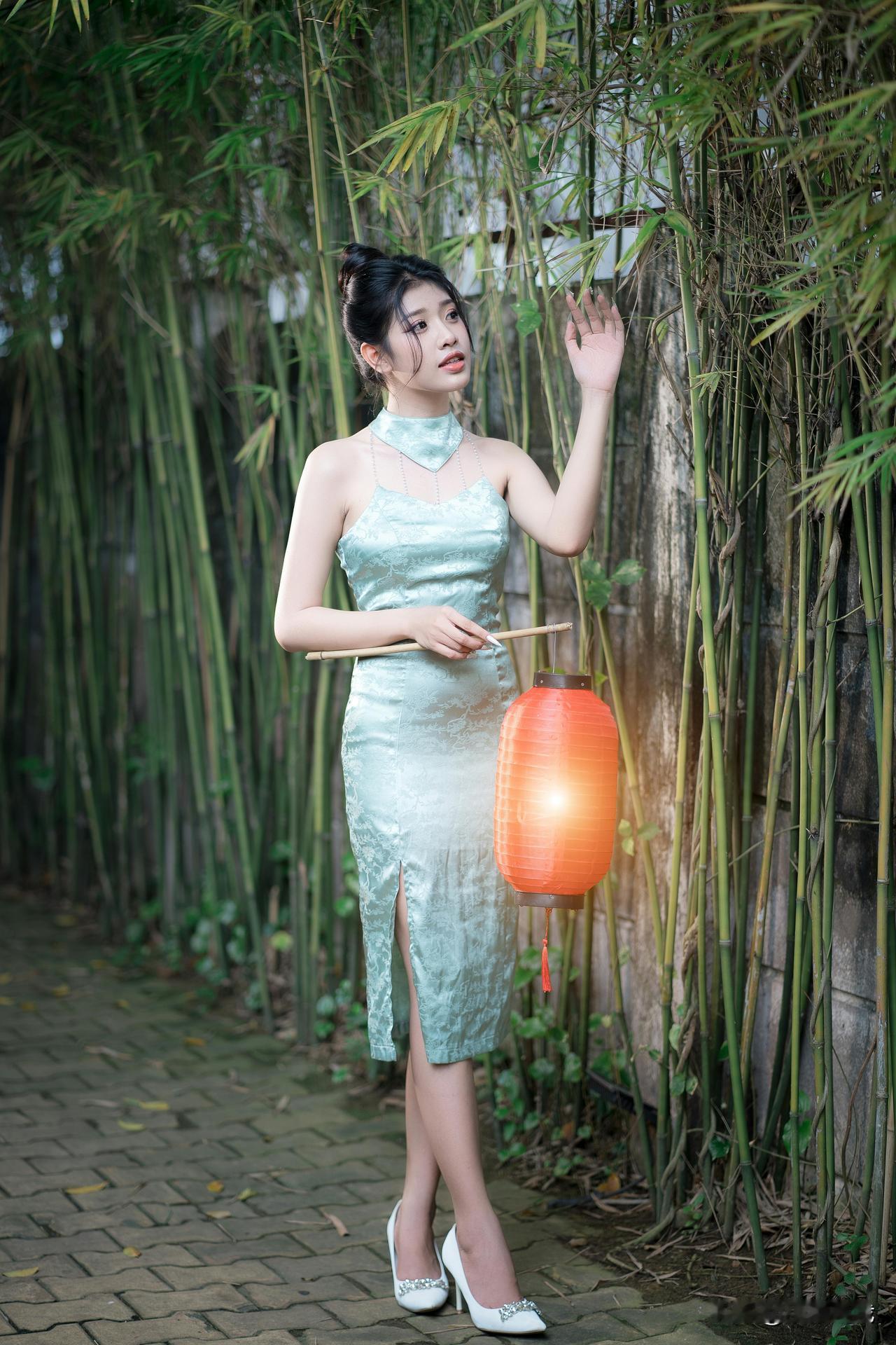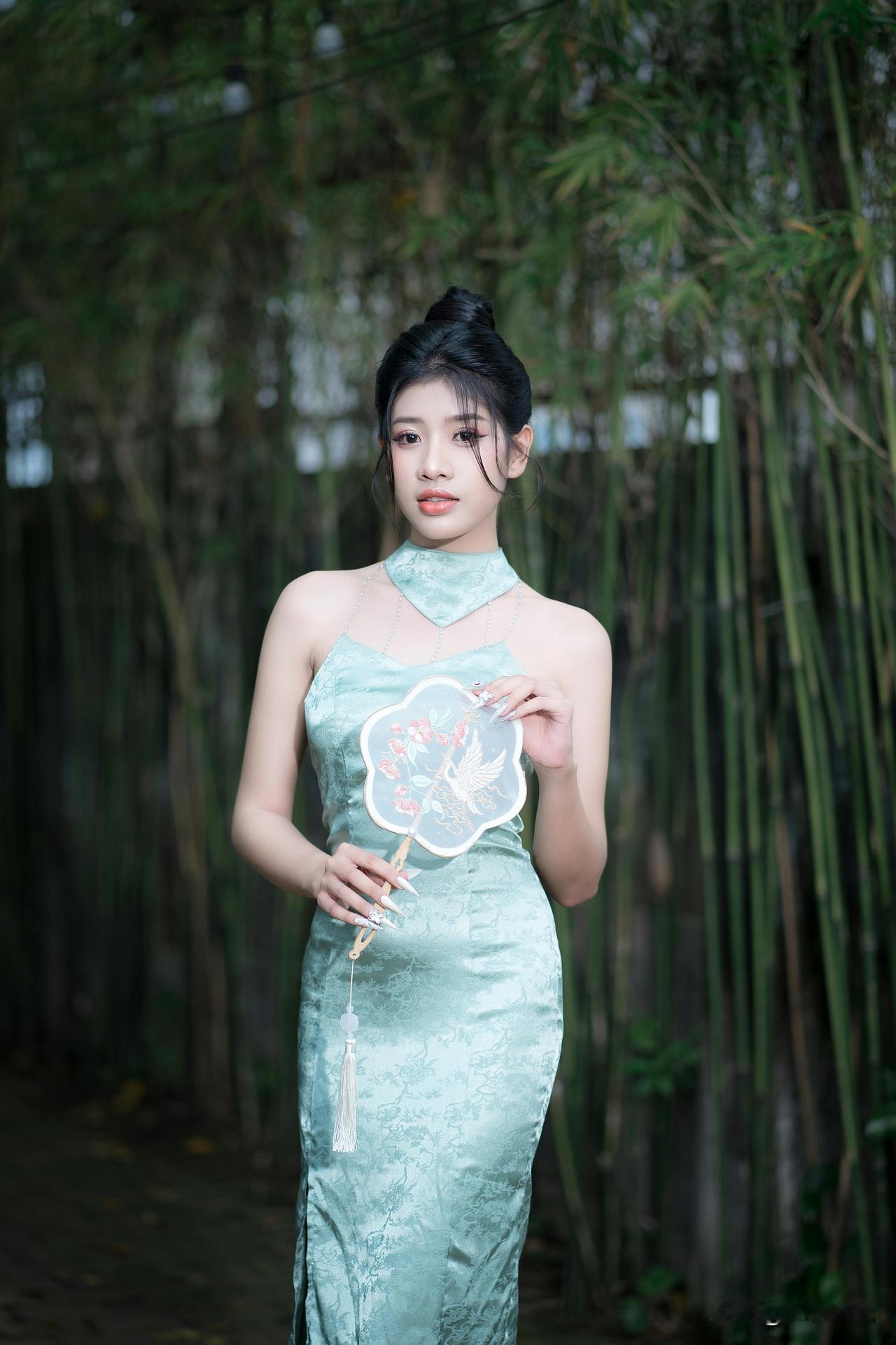 竹影轻摇处,青衫裹着江南的柔。 团扇半遮的眼波,笼灯暖透的风,纸伞斜斜挑落碎光—— 是新茶沏开的春,浸在旧时光的纹路里,软得刚好。水墨竹纹裙