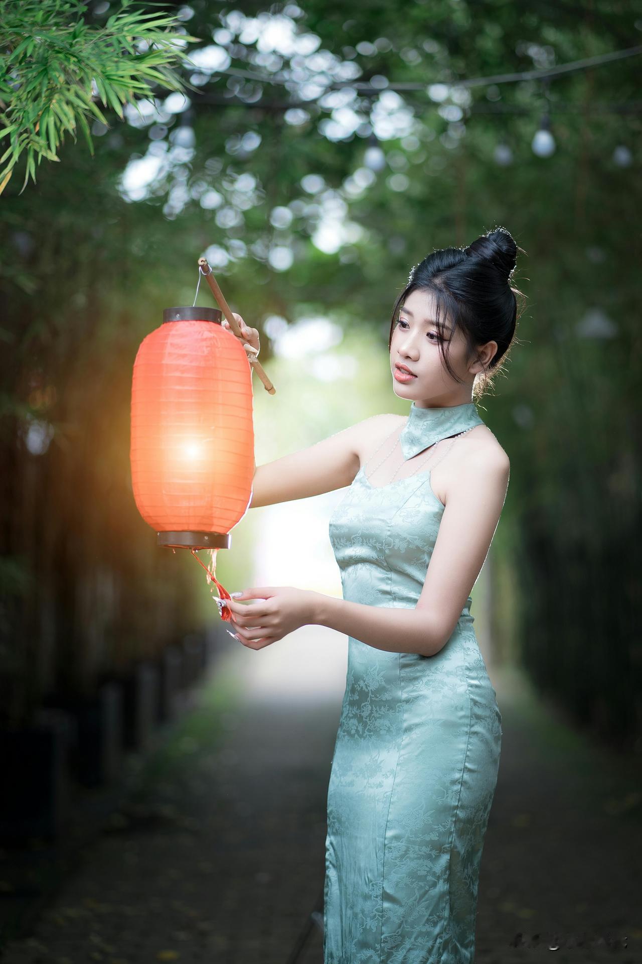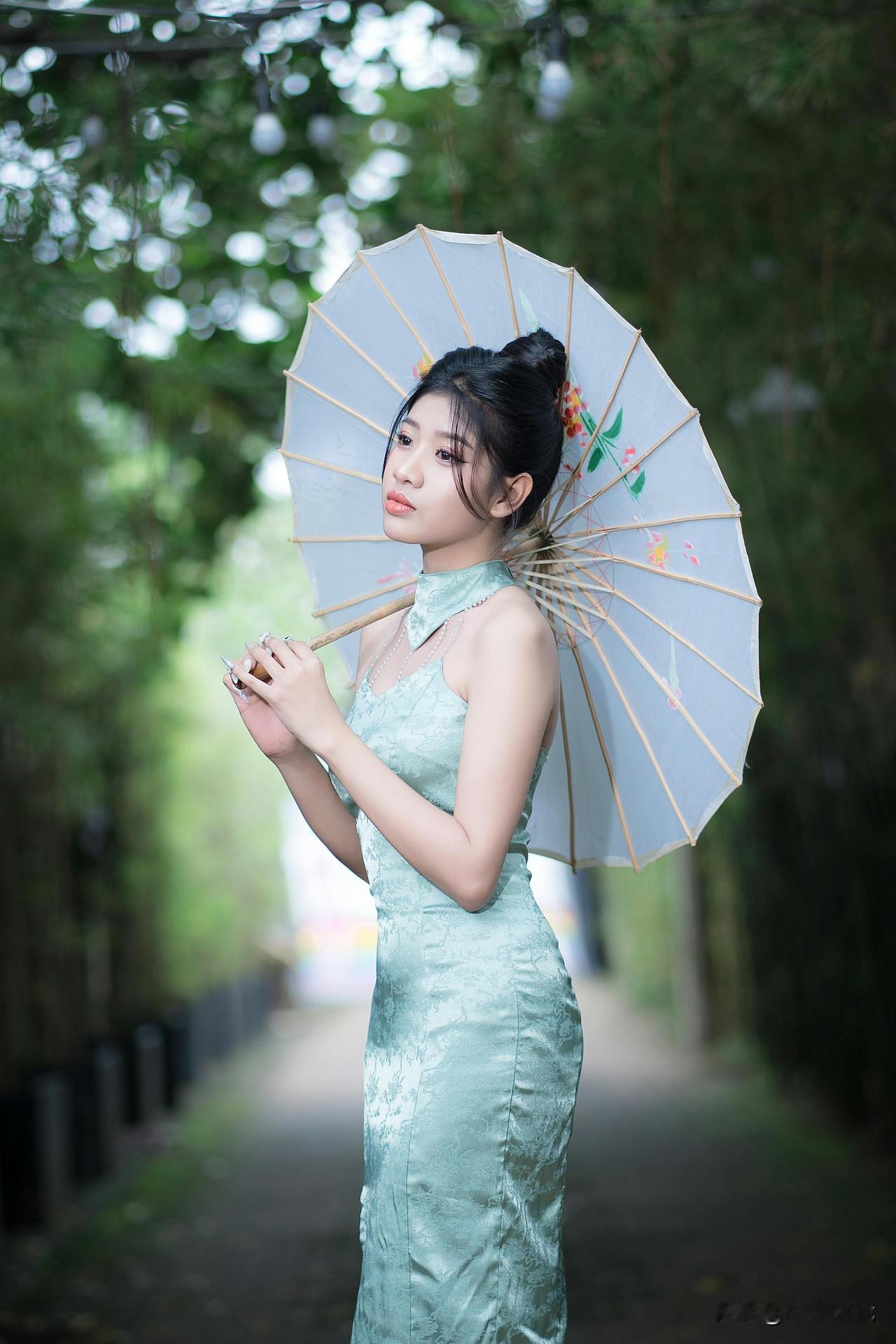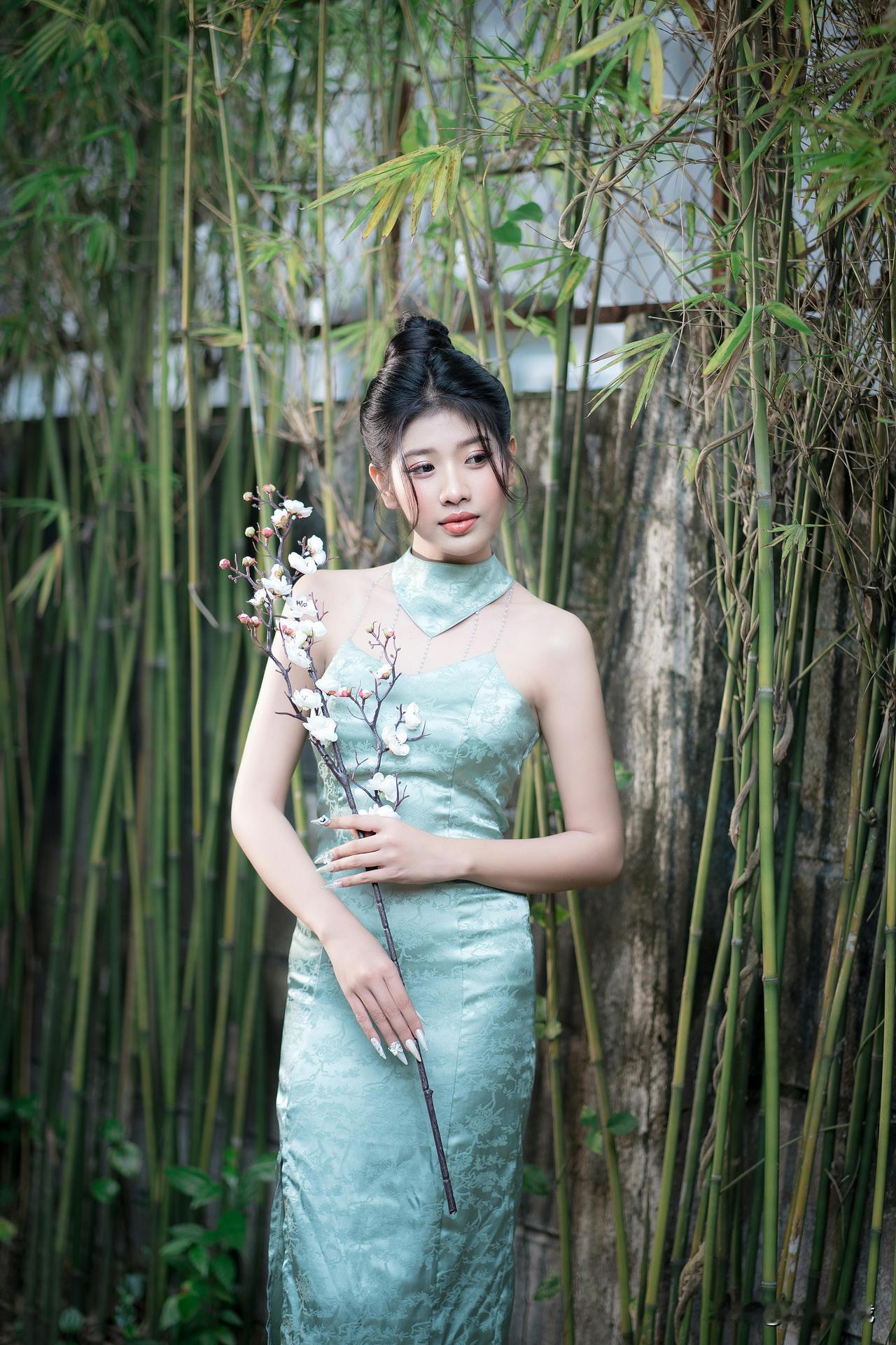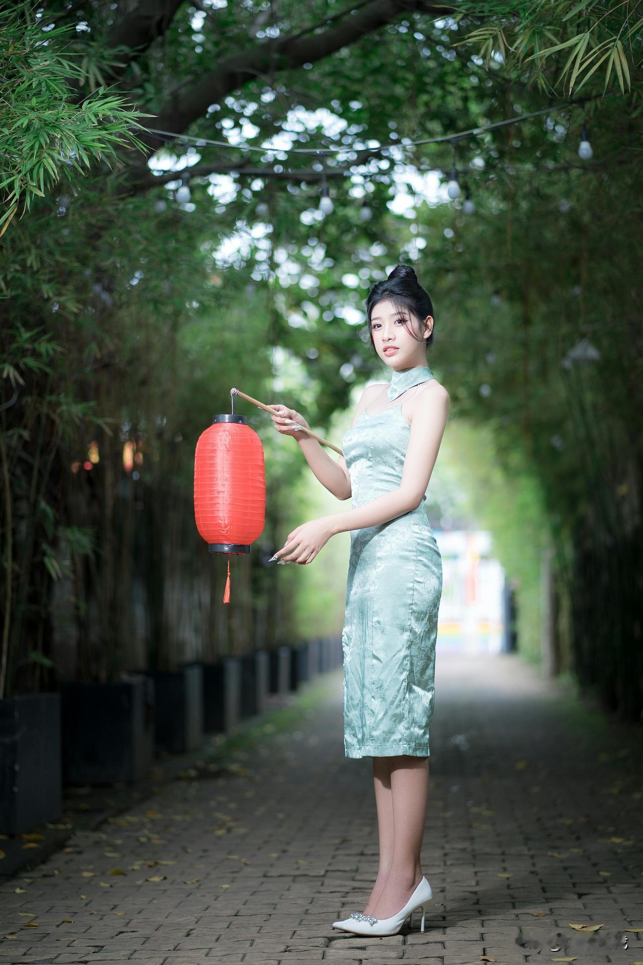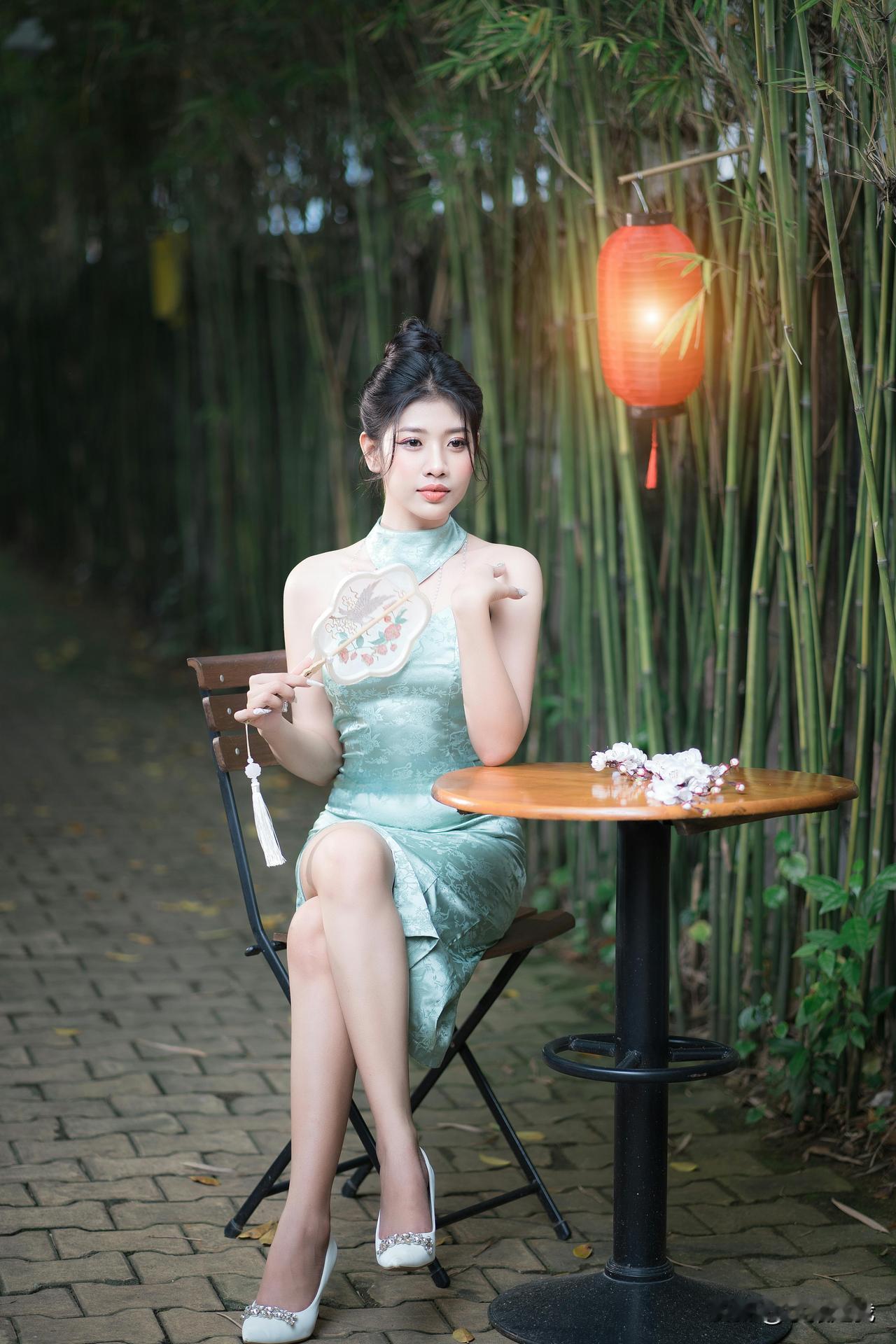 竹影轻摇处,青衫裹着江南的柔。 团扇半遮的眼波,笼灯暖透的风,纸伞斜斜挑落碎光—— 是新茶沏开的春,浸在旧时光的纹路里,软得刚好。水墨竹纹裙