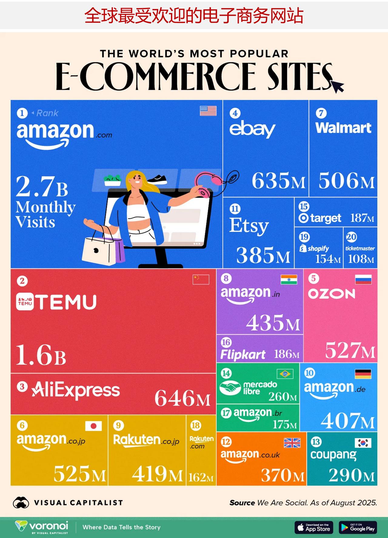 2025 年访问量最大的电子商务网站,亚马逊依旧占据主导地位 到 2025 年,全球电子商务领域的格局仍将主要由少数几家巨头掌控。尽管有数十家平台在争夺消费者的注意力,但亚马逊仍占据着显著的优势,其访问量占全球 20 大零售网站总访问量的超过四分之三。 下面图表清晰地展示了美国和中国两大平台在全球数字购物流量中的主导地位,两者合计占据了约 65%的份额。尽管像 Temu 这样的新兴平台不断崛起,但电子商务的等级结构仍相对稳定,这凸显了亚马逊持久的品牌和基础设施优势。 此次排名的数据来自“我们社交”(We Are Social),数据涵盖了 2025 年 6 月至 8 月期间的全球平均月度流量。 ——亚马逊掌控全球流量 亚马逊的旗舰网站 amazon.com 每月的访问量约为 27 亿次,占其自身排名前 20 位网站总访问量的四分之一。包括各地区站点在内,亚马逊的生态系统在全球范围内拥有无可比拟的影响力,这为其带来了 2.3 万亿美元的市值。 ——Temu 和 AliExpress 改变跨境零售格局 中国平台“Temu”(每月访问量达 16 亿次)和“阿里速卖通”(访问量达 6.46 亿次)分别位列第二和第三,这反映出中国在跨境电子商务领域正发挥着日益重要的作用。 Temu激进的折扣策略继续助力其在全球市场的拓展。这两家中国网站每月的访问量总计约达 23 亿次,约是亚马逊网站总访问量的四分之一。 ——地区领导者立场坚定 其他一些地区性的电商巨头也跻身前五名:美国的eBay和俄罗斯的Ozon。日本的乐天、韩国的Coupang以及巴西的Mercado Livre都展现了美国和中国双寡头垄断之外的地区领军企业的实力。 与此同时,Shopify 的 Shop.app 和 Ticketmaster 体现了小众零售和活动平台影响力的日益增强。