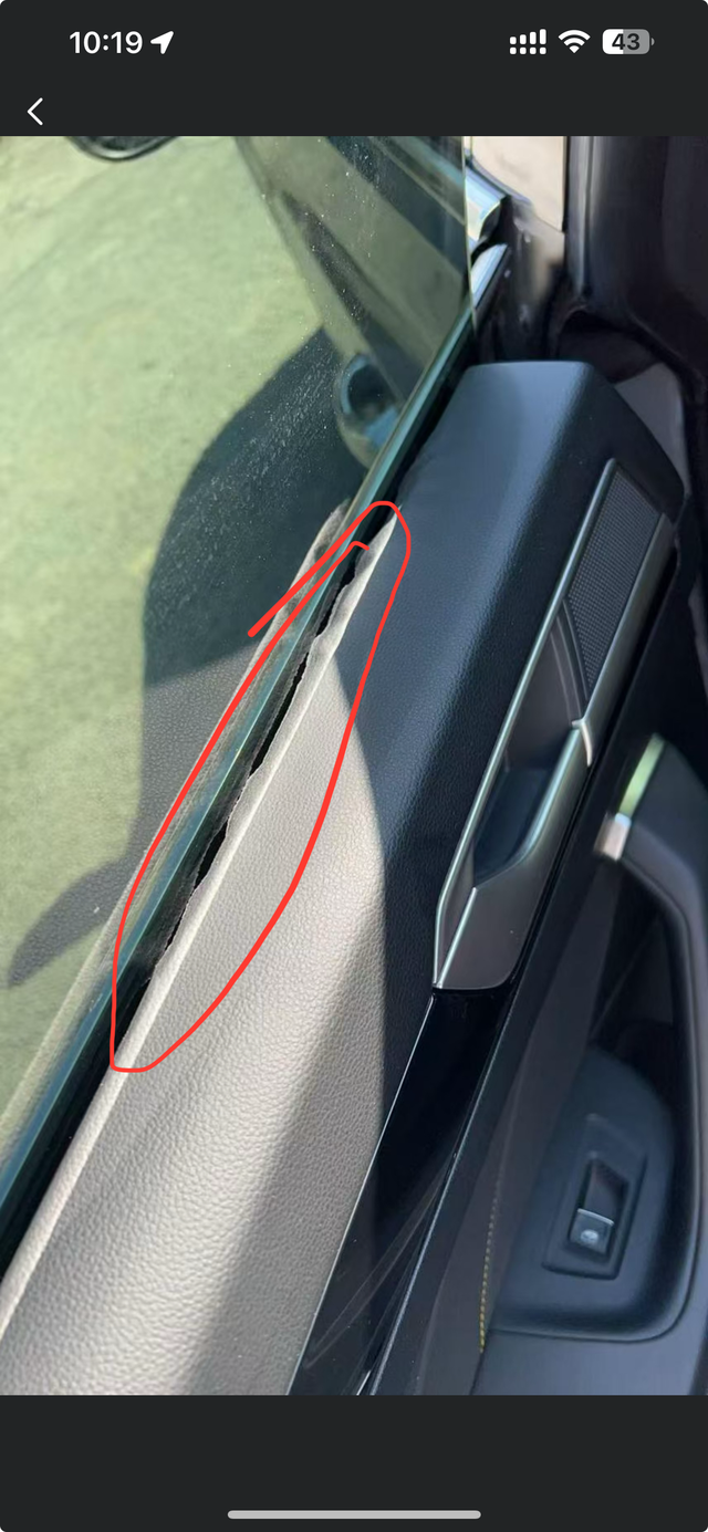 车门皮革包围脱胶 大众CC刚过维保,发现门框扶手脱胶,4S店说无法维修,只能更换门板