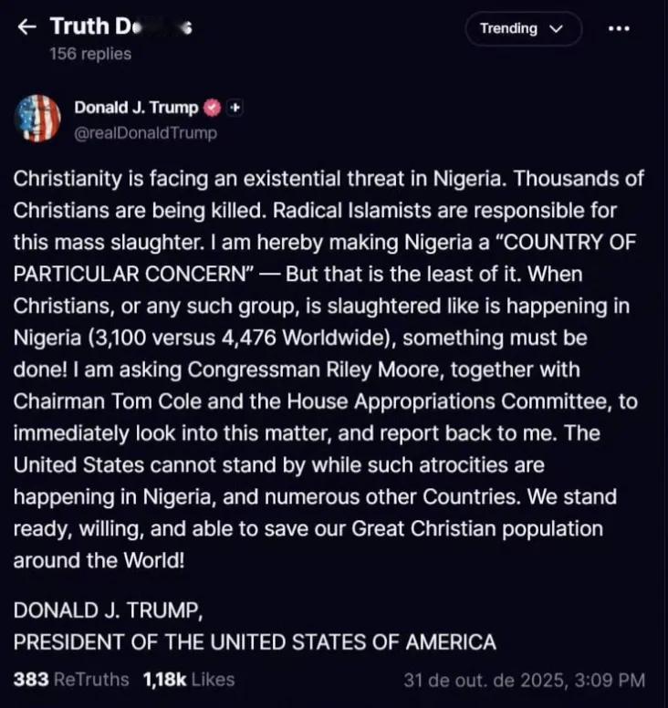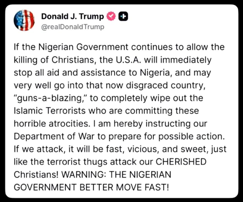 美国总统老特突然对非洲尼日利亚的基督徒表示关心了,说尼日利亚的基督徒每年都有数千人无辜被杀,他无法接受。如果尼日利亚政府继续允许杀害基督徒,那么美国将入侵尼日利亚,他已经下令美国战争部做好行动准备。 老特下达了指示,美国战争部长赫格塞思马上在社交平台X上回应:“是的,先生。对尼日利亚及世界各地无辜基督徒的屠杀必须立即停止。战争部正在准备行动。” 尼日利亚基督徒境况不妙都很多年了,主要是尼日利亚境内的极端组织“博科圣地”在对基督徒进行迫害,但老特第一次美国总统任期内也没见去关心,二度入主白宫之后也没见迅速去关心,现在突然关心尼日利亚基督徒的命运,事出反常必有妖。 实际上,老特对尼日利亚大动肝火,并不是因为基督徒的事儿,而是尼日利亚拒不接受老特的一个要求。 今年7月9日,老特把加蓬、几内亚比绍等五个非洲国家的领导人叫到白宫,逼他们签“接单协议”,接收美国遣返的“第三国”非法移民。尤其是对尼日利亚,美国想把从自家监狱里放出来的委内瑞拉籍囚犯,硬塞给尼日利亚,结果尼日利亚毫不犹豫地表态:“一个都不收! ” 8月10日,尼日利亚外交部发言人埃比恩公开表示:“就算其他非洲国家都低头,我们也绝不接盘! ” 一直到现在,尼日利亚的态度都没有任何改变,坚决不接受美国的要求。而尼日利亚不同意,其他非洲国家也就敢对美国说不,搞的老特遣返非法移民到第三国的计划无法进行。所以,老特现在跳脚了,对尼日利亚发出战争威胁,想以此逼迫尼日利亚接收美国放出来的委内瑞拉籍囚犯。#尼日利亚#