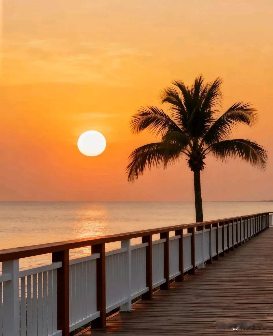 日落时分,海边的棕榈树与木栈道相映成趣,宁静而美好。