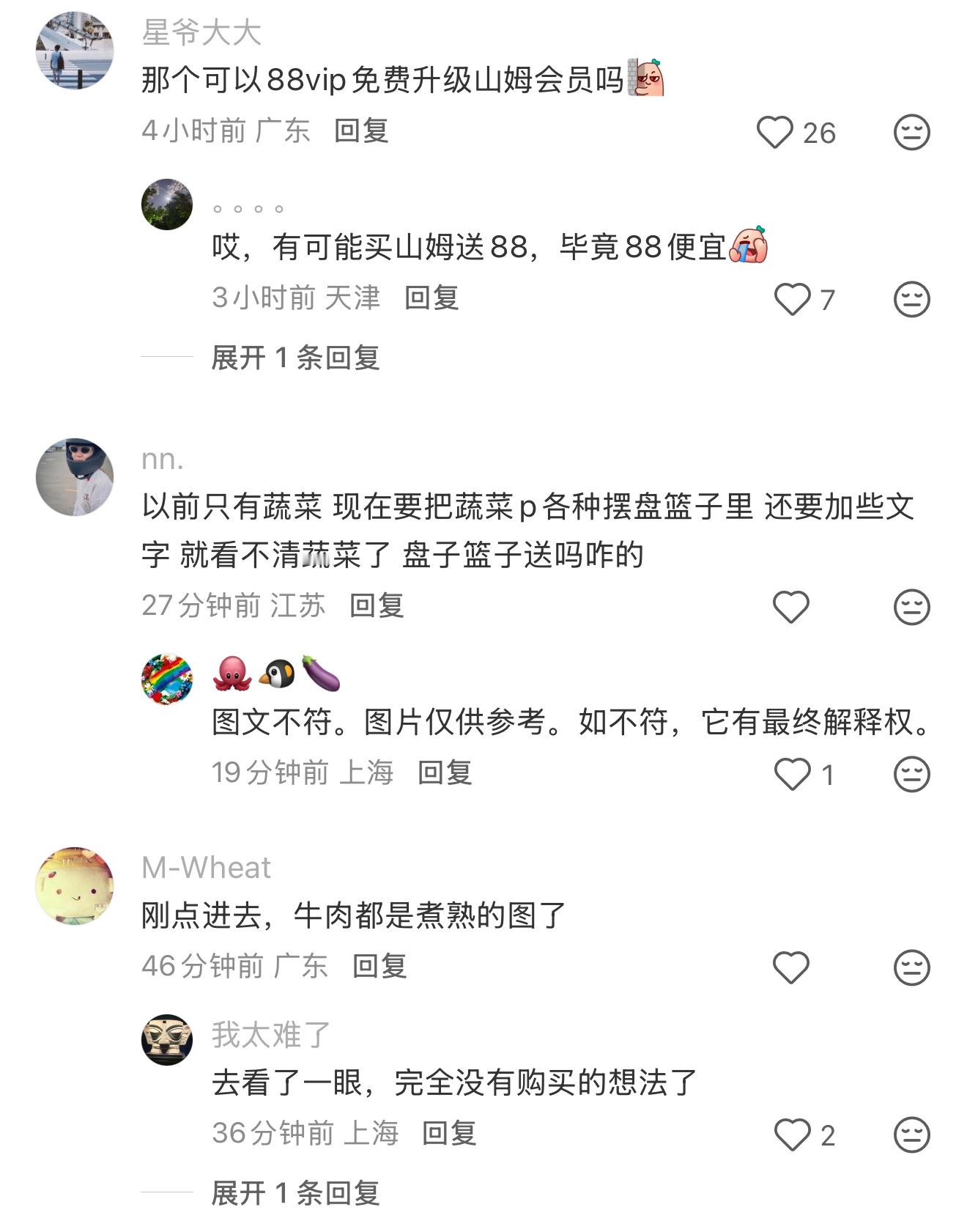 山姆App的蔬菜牛肉照片全部换成了火锅店风格,会员们又炸了