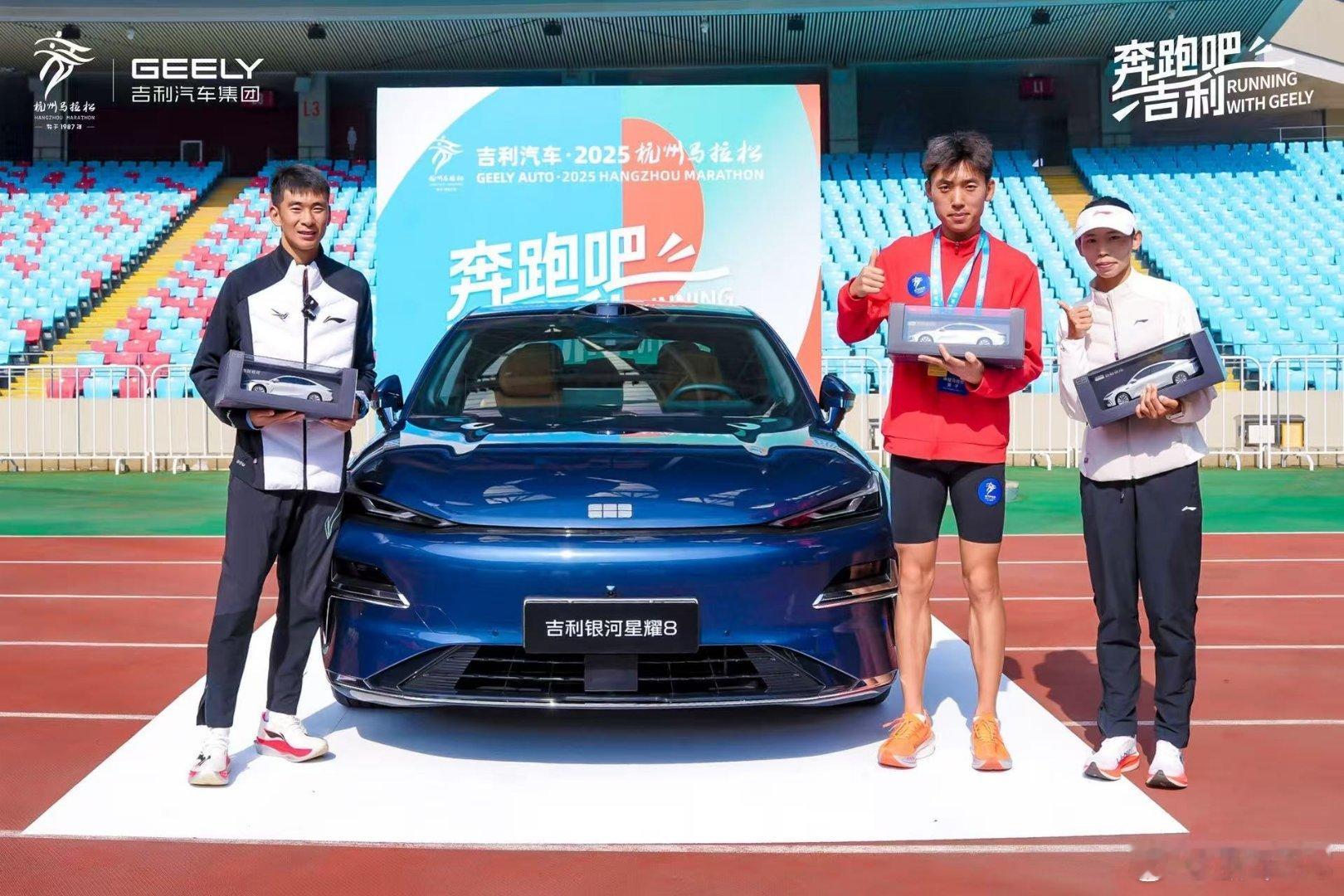 吉利汽车2025杭州马拉松 今天快乐开跑,吉利全程守护,致敬每一位跑者!恭喜打破杭马赛会中国籍全马、半马纪录的冠军选手获得杭马大奖——吉利银河M9、吉利银河星耀8。