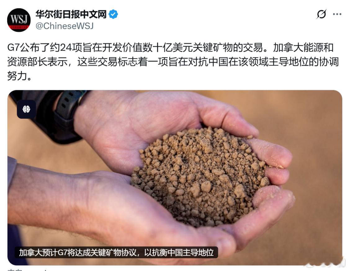 华尔街日报:G7公布了约 24 项旨在开发价值数十亿美元关键矿物的交易。加拿大能源和资源部长表示,这些交易标志着一项旨在对抗中国在该领域主导地位的协调努力。