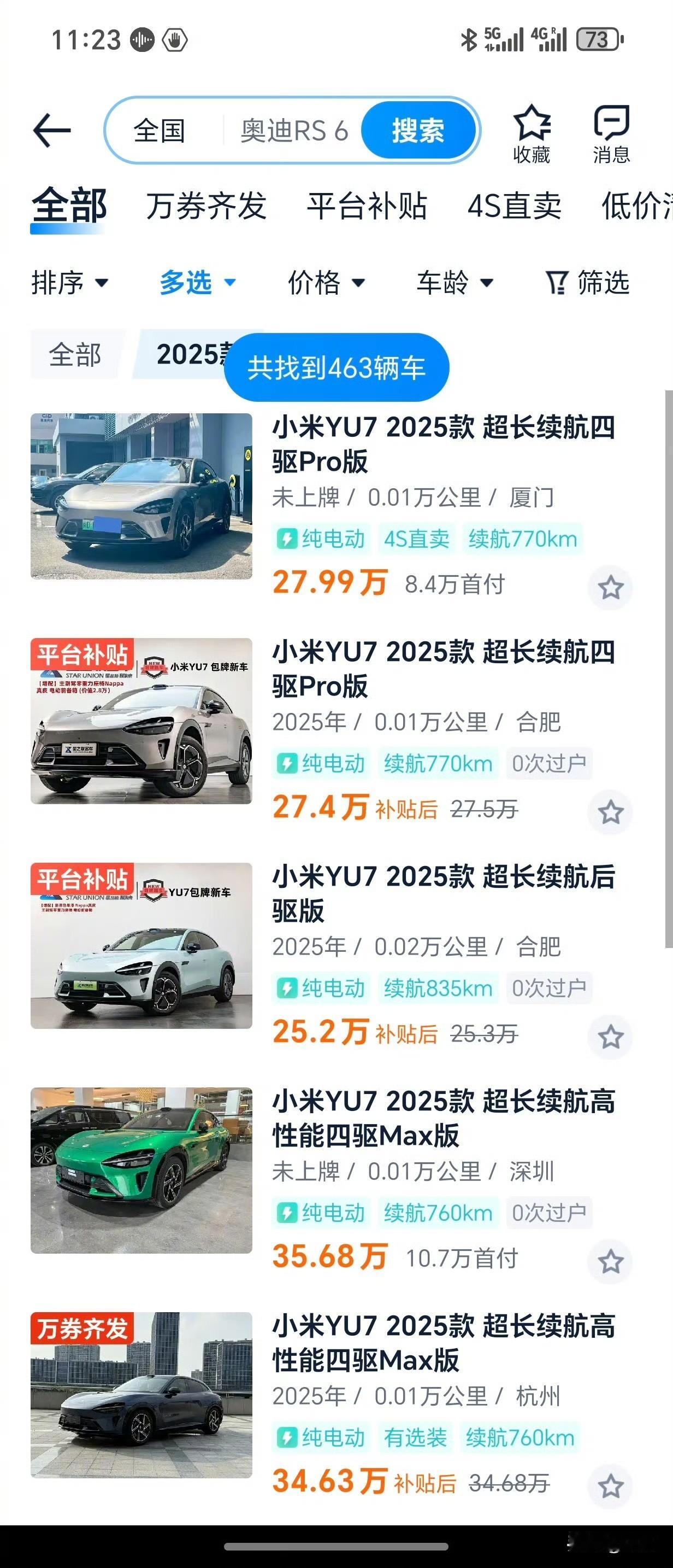 陈震: 小米YU7成国产新能源车保值率第一,还是可以的! 就在刚才,陈震在某某二手车交易平台搜索了一下小米的这款SUV,没想到在二手平台卖这款车的还挺多的! 那个市区版本的居然可以卖到27.99万,而配置最高的Max版本可以卖到35万上下,即便是入门的后驱版本也可以卖到25万左右! 难怪有人说,要看一个车到底怎么样,就得看这个车在二手车的店里面卖什么价,而根据目前这些平台网上的数据来看,目前小米的这款SUV保值率居然排到了头一个! 所以陈震根据这个数据得出这个结果,还可以,只是不知道在现实市场环境中,这个保质率怎么样,毕竟每个地方每个店面它的不一样,而且车子状况也不一样,所以可能一样的车,不同的地方,在价格上,还是有比较明显的区别。