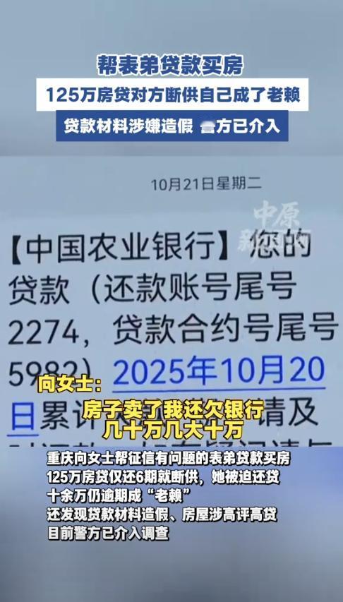 重庆,女子的表弟因征信有问题,无法贷款买房,于是,找到女子帮忙,还给出1万元的好处费。女子没多想,就答应了,随后,从银行顺利贷款125万,月供5000元,同时,房子落在女名下,月供表弟还。谁知,表弟只还了6个月,就没钱还了,为了不影响自己的征信,女子不仅花光了积蓄,又向别人借6万多还贷款,但这只是杯水车薪,最后,因逾期成了“老赖”。走投无路之下,女子决定卖房还还贷款,却发现房子只能卖五六十万。女子察觉不对劲,赶紧去银行查看贷款手续,果然从中发现了问题,自己哪是帮忙贷款,分明成了“职业贷款人”。 据中原新闻网10月29日报道,向女士平时在老家忠县的工地上打零工,收入虽然不稳定,但日子过得也还安稳。 2023年5月,表弟周先生火急火燎地找上了门,说自己看上了一套房子,但因为征信有问题,没法从银行贷款。 他希望表姐向女士能出面,用她的名义来办理这笔购房贷款,为了让表姐放心,周先生拍着胸脯保证,每个月5000块的月供都由他来还,绝对不给表姐添一点麻烦。 不仅如此,他还当场拿出一万块钱现金,说是给表姐的“好处费”。 看着一脸诚恳的表弟,又想着都是自家人,向女士心一软就答应了,她把自己和丈夫的身份证、户口本、结婚证都交给了表弟,让他去办理相关手续。 很快,贷款就批下来了,足足125万,房子也顺利买下,落在向女士名下,起初的6个月,表弟确实信守承诺,每个月都按时还款,总共还了3万多元。 这让向女士彻底放下了心,觉得当初的决定没错,可好景不长,到了2023年底,表弟那边突然就断了供,电话里支支吾吾,翻来覆去就一句话:“姐,我实在没钱了。” 这一下,每个月5000元的房贷就像一座大山,直接压在了向女士的肩上,她一个打零工的,哪有能力承担这么高的月供? 为了不让自己的征信出现问题,她只能咬着牙,拿出了自己辛苦攒下的所有积蓄去填这个窟窿,积蓄花光了,她又厚着脸皮四处找亲戚朋友借钱,东拼西凑借了6万多块,但在这笔巨额贷款面前,这点钱不过是杯水车薪。 最终,房贷还是逾期了,银行的催款通知和法院的传票接踵而至,向女士的名字,也出现在了失信被执行人名单上,成了一个名副其实的“老赖”。 生活被搅得天翻地覆,向女士走投无路,唯一的办法似乎只剩下卖掉那套惹祸的房子,可当她联系中介一打听,心彻底凉了。 当初买这套房子花了135万,现在市场行情不好,中介告诉她,这房子撑死也就卖个五六十万,这意味着,就算把房子卖了,她不仅一分钱拿不到,还得倒欠银行好几十万的贷款。 这太不正常了!一套房子,短短一年时间,价值怎么会缩水这么多?强烈的违和感让向女士心生疑窦,她立刻赶到银行,要求调取当初办理贷款的所有资料。 不看不知道,一看吓一跳,这些所谓的“证明材料”,简直漏洞百出,假得离谱,一份伪造的离婚证复印件赫然在列,可她和丈夫明明婚姻关系存续,感情和睦。 更夸张的是一份收入证明,上面写着她在江津一家具卖场担任销售经理,月收入高达14000元,还附上了一位“负责人”张先生的联系方式。 向女士哭笑不得,自己连江津都很少去,怎么就成了那里的销售经理?记者按照证明上的电话打过去核实,电话那头的张先生也是一头雾水,明确表示公司里根本没有向女士这个人。 最关键的证据出现在贷款合同上,银行那份贷款合同上,白纸黑字写着购房总价是158万元,而向女士实际的购房合同上,总价却是135万元。 两个合同之间,凭空多出了23万元的差价!所有的线索串联起来,一个可怕的骗局浮出水面,很明显,有人利用向女士的身份信息,伪造了她的婚姻状况和工作收入,将她包装成一个具备高还款能力的“优质客户”。 同时,勾结评估公司,恶意抬高房产的评估价值,制造出所谓的“高评高贷”,通过这种方式,他们从银行套取了远超房屋实际价值的贷款,而那多出来的几十万,恐怕早就进了操盘者的口袋。 向女士悲哀地发现,自己从头到尾都只是一个工具人,一个被利用来背负债务的“棋子”,目前,向女士已经报警,希望法律能还她一个公道。但眼前的困境,依旧让她和家人愁云惨淡。 这件事也给我们所有人敲响了警钟:亲戚朋友之间帮忙,一定要擦亮眼睛,特别是涉及到个人征信和巨额资金担保的时候,千万不能因为情面或一点蝇头小利就盲目答应。 在任何文件上签字之前,务必看清每一条款项,确认每一个细节,否则,你可能在不知不觉中,就成了别人圈套里的“背债人”,到时候后悔都来不及。 信源:中原新闻网2025-10-29——帮表弟贷款买房 贷款材料造假 125万房贷对方断供自己变老赖