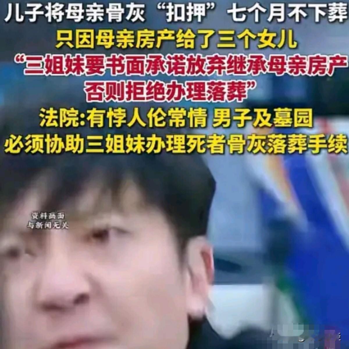 上海,男子母亲去世,他却扣下合葬墓地认证书,不让母亲下葬,原因是母亲把家产都分给3个姐姐,他心生不满,甚至以此要挟3个姐姐出具书面承诺,放弃遗产继承。还向墓园放话:“我不到场,谁都不能落葬。3个姐姐看着母亲的骨灰在殡仪馆搁置7个月,迟迟无法入土为安,急得团团转却无计可施。无奈之下,她们只能将弟弟和墓园一并告上法庭,法院判了! 都说养儿能防老,可上海的陈阿姨去世都7个月了,骨灰还在殡仪馆里放着,没法跟六年前走的老伴合葬。 这事说出来都让人难以置信,而搞出这出的,不是外人,正是她亲儿子王某。 二十多年前,陈阿姨和老伴身体还硬朗,就想着提前把身后事安排好,省得给孩子们添麻烦。 刚开始女儿们听母亲说要买墓地,都不同意,觉得父亲身体都好好的,听着挺瘆人的。 可陈阿姨很开通,耐心跟女儿们讲,到啥时候都有那么一天,事先都安排好心里踏实。 3个女儿都很孝顺,吃的喝的,穿的用的,从来都没让父母缺过,还常常陪在身边,街坊邻居都羡慕她有福气,有3个贴心的小棉袄。 王某在家里是老小,3个姐姐从小就疼他,什么事都让着他,有姐姐们照顾父母,王很省心,基本上不用管。 父母要选好墓地,几个女儿陪着跑前跑后,最后选了个双人合葬墓。 按当地规矩,有儿子后事得儿子操办,所以墓穴认购证上写的是儿子王某的名。 女儿们也没多想,觉得只要爸妈百年后能好好在一块儿,谁的名字无所谓。 2016年,陈阿姨老伴先走了,她就把认购证给了王某,让他全权处理下葬的事。 之后证也一直放王某那儿,谁能想到,这张纸后来会变成拦路虎? 直到2022年,陈阿姨生病走了。王某一开始还按流程办了后事,张罗得挺上心。 可收拾遗物时,翻出了一份公证处的遗嘱,上面明明白白写着,陈阿姨的所有遗产都归三个姐姐,提都没提他。 这下王某不干了,觉得母亲太偏心,心里的火气一下子就上来了。 他是唯一的儿子,父母的遗产都应该是他的,母亲老糊涂了,还偷偷立遗嘱公正,他才不按遗嘱来,反而把主意打到了母亲的骨灰上。 找到3个姐姐就放狠话:想让妈跟我爸合葬,你们得写书面保证,把遗产都让出来,不然这骨灰就一直放殡仪馆! 怕姐姐们偷偷去办下葬,他还专门跑到墓园和负责人交代:认购证在我手里,我不到场,谁都别想让我妈下葬! 墓园也左右为难,一边是拿着证的认购人,一边是急得团团转的家属,只能按规定来,没王某点头,就是不敢给办手续。 就这样耗了7个月,3个姐姐好话歹话都说遍了,软磨硬泡,王某就是油盐不进。 看着母亲的骨灰迟迟不能入土,姐姐们实在忍不了了,干脆把弟弟和墓园一起告上了法院。 她们就一个要求:让妈赶紧跟爸合葬,了却老人家的心愿。 《民法典》第八条:民事主体从事民事活动,不得违反法律,不得违背公序良俗 。 王某以遗产分配不均为由,拒绝让母亲落葬,将骨灰搁置7个月。 这种行为违背了传统的入土为安的伦理和公序良俗。虽然他是墓穴认购人,但不能以此要挟亲属,损害母亲的身后权益。 法院判定王某的行为不当,应配合办理落葬手续。 法庭上,姐姐们急得直哭:“那墓是父母一起买的,本来就是为了合葬!墓园凭啥只认证上的名字,不让我们办手续? 可王某还嘴硬,说必须先把遗产的事解决了,再谈下葬的事。 《殡葬管理条例》第14条:办理丧事活动,不得妨害公共秩序、危害公共安全,不得侵害他人的合法权益 。 王某作为儿子,为了争遗产,侵害了母亲的墓地使用权和人格利益,也给三个姐姐带来了精神痛苦。 墓园明知墓穴是为老两口合葬购买的,仅因王某不到场就拒绝办理落葬手续,没有履行协助家属完成落葬的义务。 最后法院判决,骨灰落葬的权利,比争财产重要多了,王某拿遗产当要挟,不让母亲下葬,这根本不合情理,也违背规矩。 墓园明知那是老两口的合葬墓,姐姐们也是亲家属,就因为王某不到场就不办事,这也不对。 判决下来,王某得在10天内配合姐姐们和墓园,把陈阿姨的骨灰下葬;墓园也得赶紧办手续不能再拖。 至于王某说的遗嘱不公问题,如果有异议,可以重新申诉,不能以此为理由不让母亲落葬。 王某的行为,是对“孝”字最彻底的背离,更是对逝者最无礼的冒犯。 母亲生前为子女操劳,身后却因一张遗嘱、几分家产,让骨灰在殡仪馆搁置7个月,连与老伴合葬的心愿都要被亲生儿子当作谈判筹码。 三个姐姐没有因弟弟的要挟妥协,而是选择用法律捍卫母亲的身后尊严。 而法院的判决,不仅是对王某不当行为的纠正,更是对“入土为安”传统伦理的维护。 钱财终是身外物,亲情才是一辈子的羁绊。王某或许能争到一时的利益,与亲姐姐针锋相对。 别让利益蒙蔽双眼,别让铜臭味玷污了血脉亲情,更别让逝去的亲人,为活着的人的贪婪买单。 对于王某的行为,你怎么看呢?欢迎评论留言! @静心法谈 学法辨是非,慬法不吃亏。