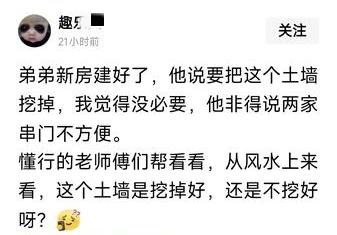 网友发问:单从风水层面来看,中间的这个土坡是否该挖掉呢?民间流传着“左青龙,右白虎”的说法,要是把中间的土坡挖掉,便会形成白虎压制青龙的态势,这对哥哥而言似乎有些不利。 弟弟提议将其挖掉,称这样兄弟间串门会更便利。 对此你怎么看?