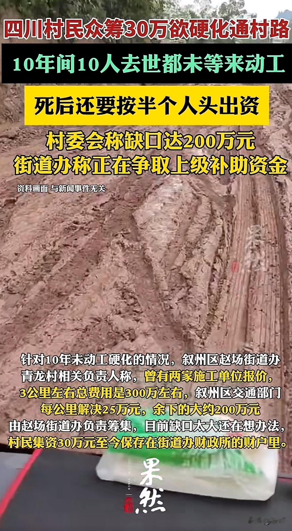 四川宜宾青龙村10组村民,2014年每人集资600元,2022年每人再集资1000元,去世村民按半人出资,累计凑了30万,想硬化3公里的泥泞路。这条路雨天打滑常翻车,小车根本没法过。 10年过去路没动工,已有10位集资村民离世。相关部门说总造价要300万,补助加集资还差200万,钱存在专户没动,还在争取上级资金。 农村修路该政府主导,村民真心盼路通才自愿掏钱。10年多次承诺落空,太伤民心。资金缺口得想办法解决,不能一直让村民等。希望能尽快落实政策,让村民早日走上平整路,别让集资款寒了大家的心。