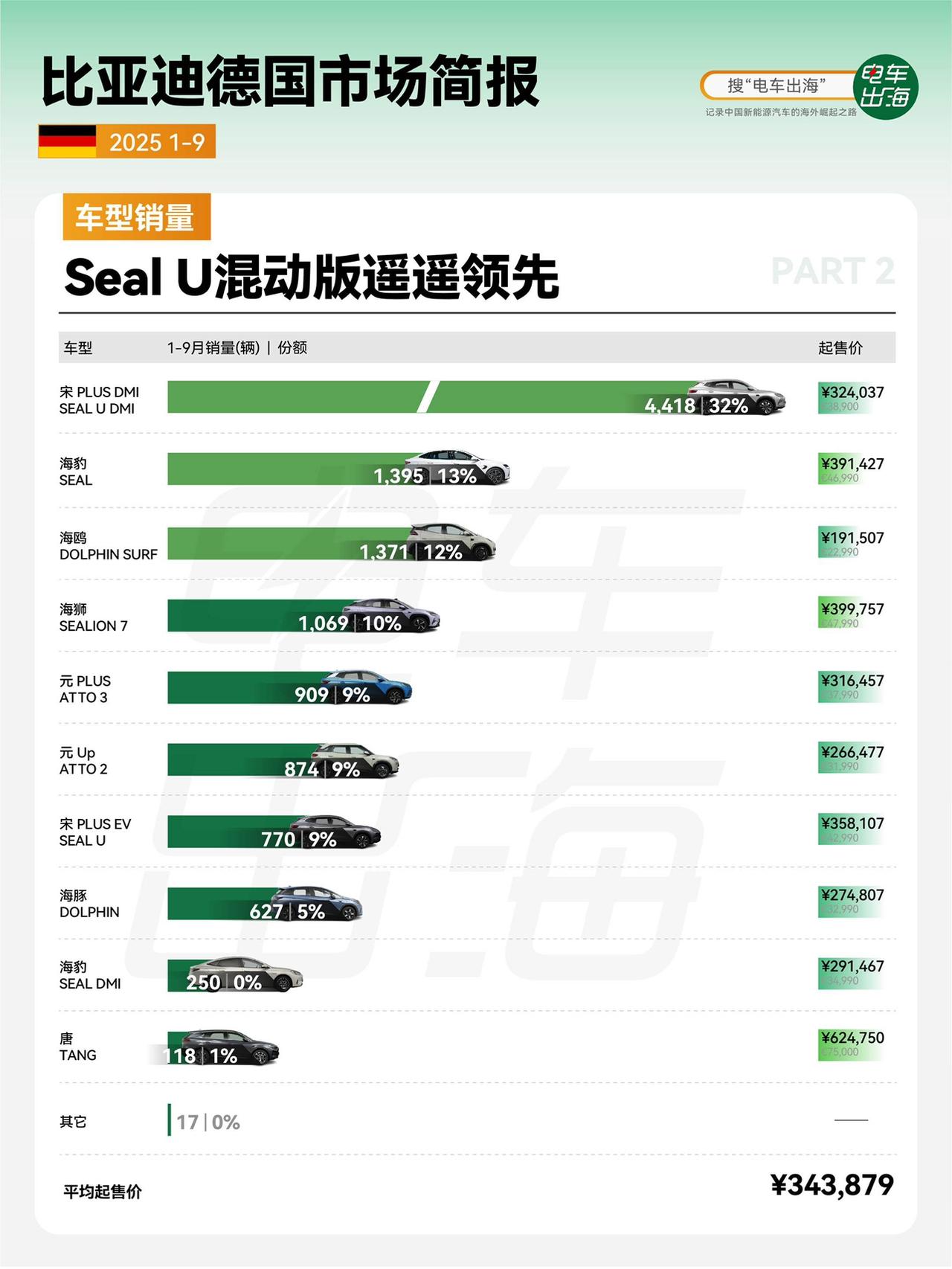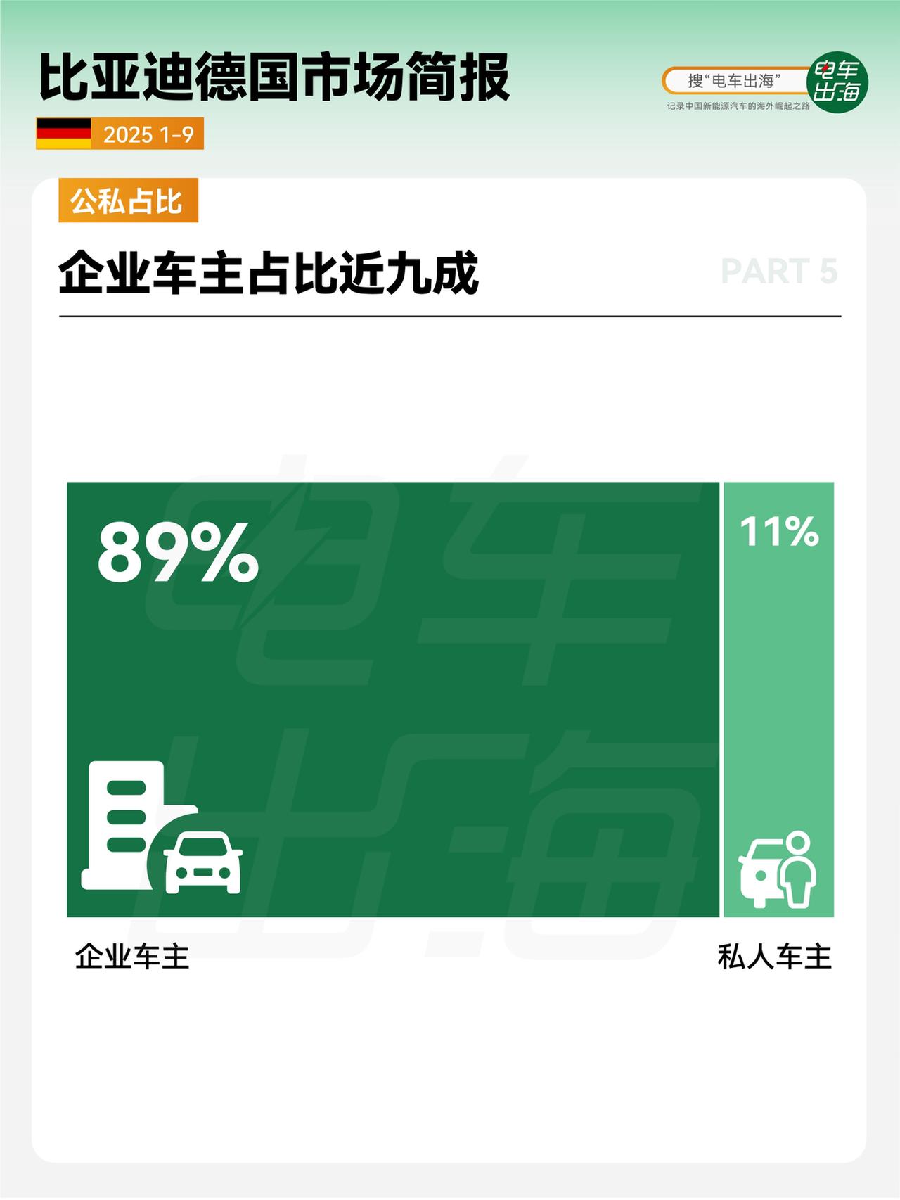 补充学习《比亚迪德国市场简报》,增加颜色偏好和客户画像公私占比的维度,至于比亚迪公司客户占比这块,我后面单独讨论下。 1. 市场表现 稳居中国品牌销量第一,2025年前三季度销量超1.1万台。 2. 车型销量和价格 Seal U插混版遥遥领先,贡献销量大头,德国在售车型平均起售价34万起。 3. 车型偏好 SUV销售为主,中型SUV超45%。 4. 燃料偏好 纯电为主,占比60%,插混增长势头可观。 5. 客户构成 企业车主占比近九成。 6. 颜色偏好 黑白灰占主导。 7. 门店布局 德国已建60+门店,全国全覆盖。