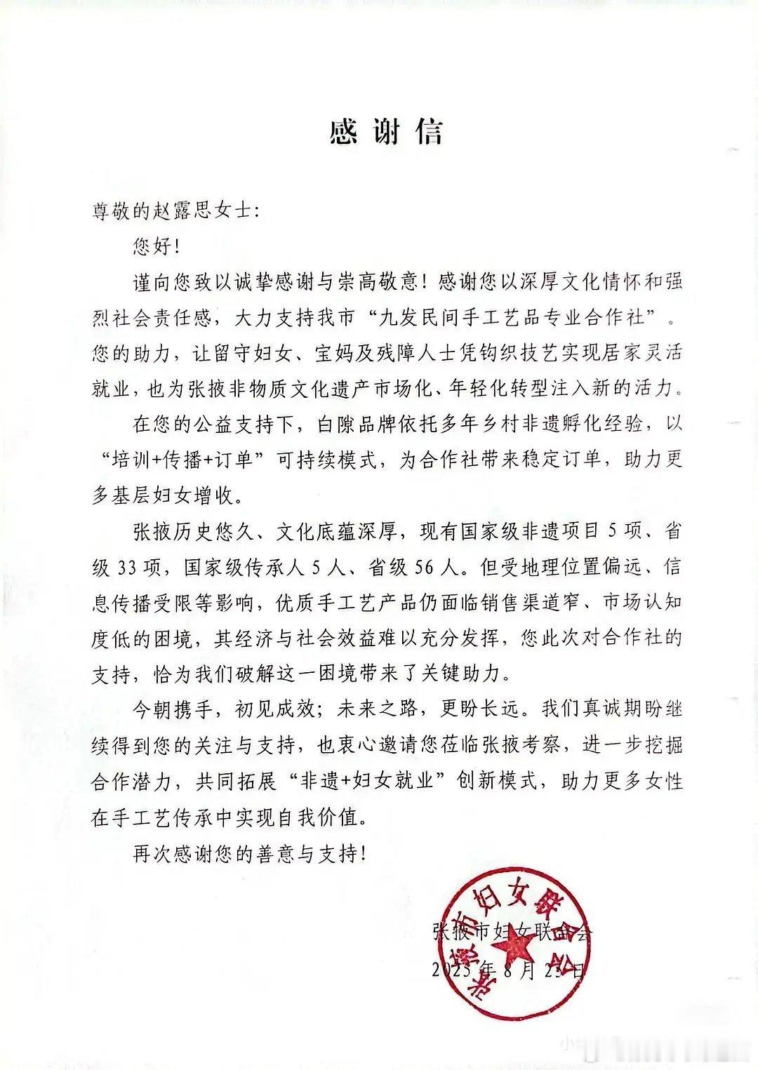 甘肃张掖市妇联此前还给赵露思发过感谢信