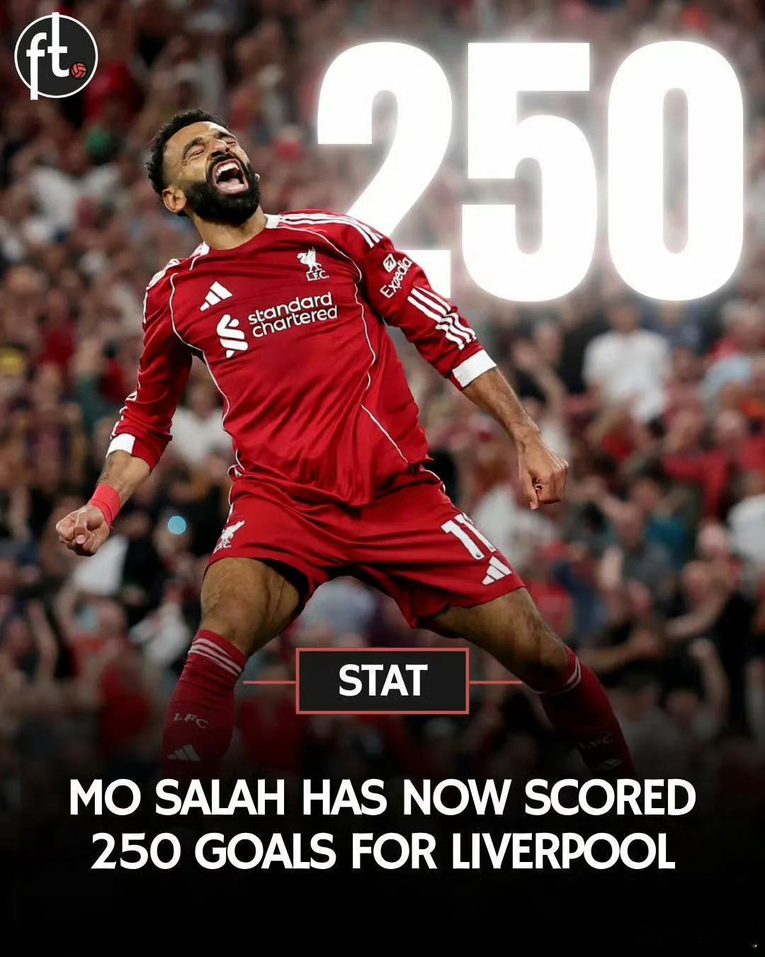 萨拉赫成为利物浦队史第三位达成250粒进球的球员