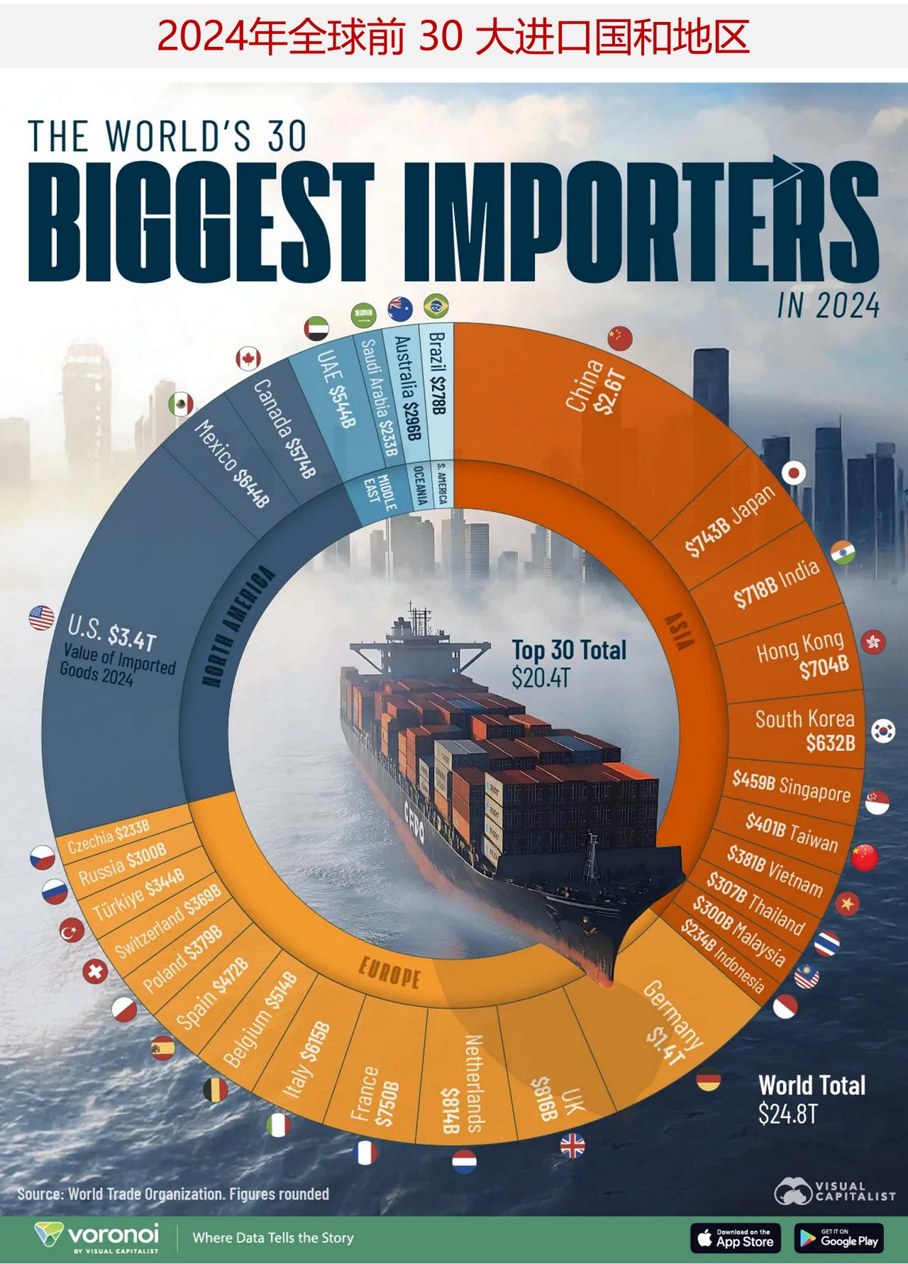 一图读懂2024年全球前30大进口国和地区 下面这张图表展示了全球前30
