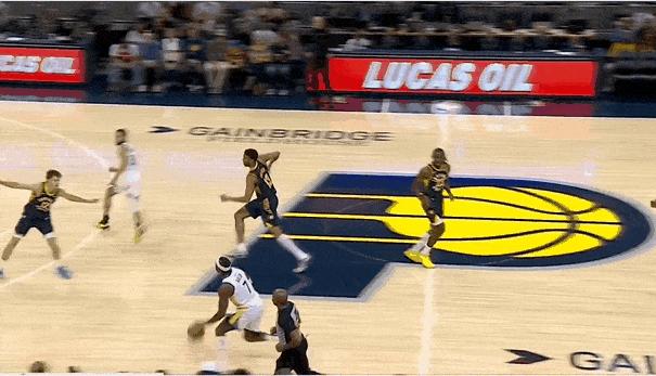 斯蒂芬·库里在对阵步行者的首节比赛里,接希尔德的长传,撤出三分线外后出手,被布拉